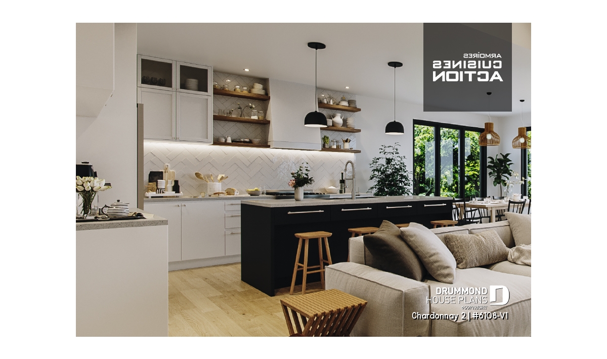This magnificent house also offers a garage with workshop area, as well as a basement to be finished according to your family needs, but note that other types of foundations are also available. This plan is also available without a garage, see the Chardonnay plan (# 6108) which offers a garage in addition to some interior modifications.