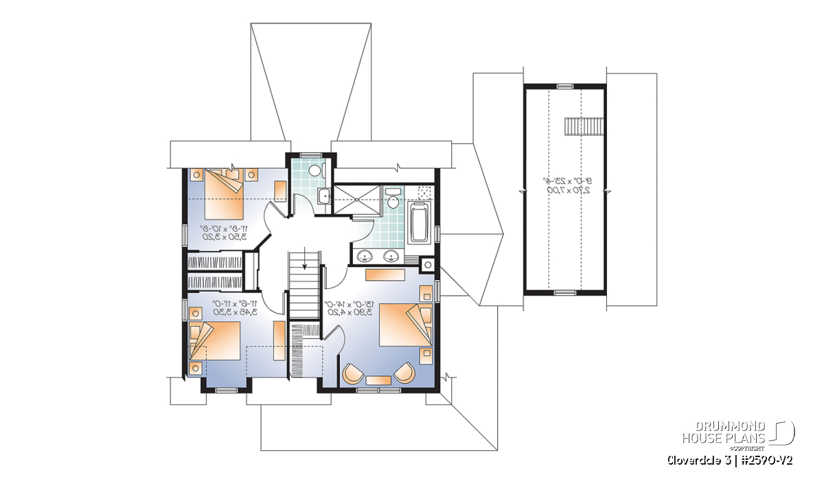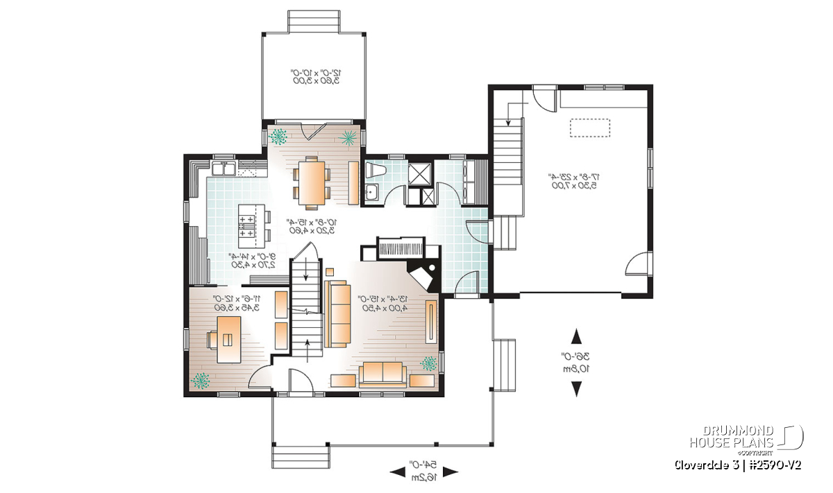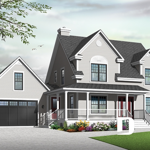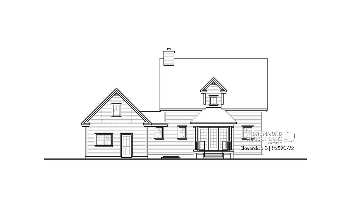 Since the launch of model 2590, it has been an extremely popular choice for homeowners looking for country charm. The graceful sloping roof is punctuated by a greater and lesser gable and the entrance and service entry are sheltered by an enchanting wraparound porch. The addition of an attached garage adds additional convenience to this perennial favourite.