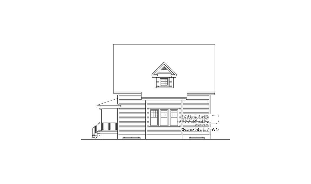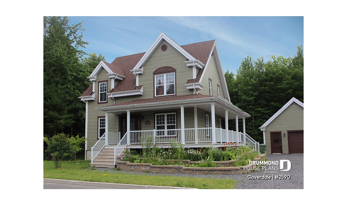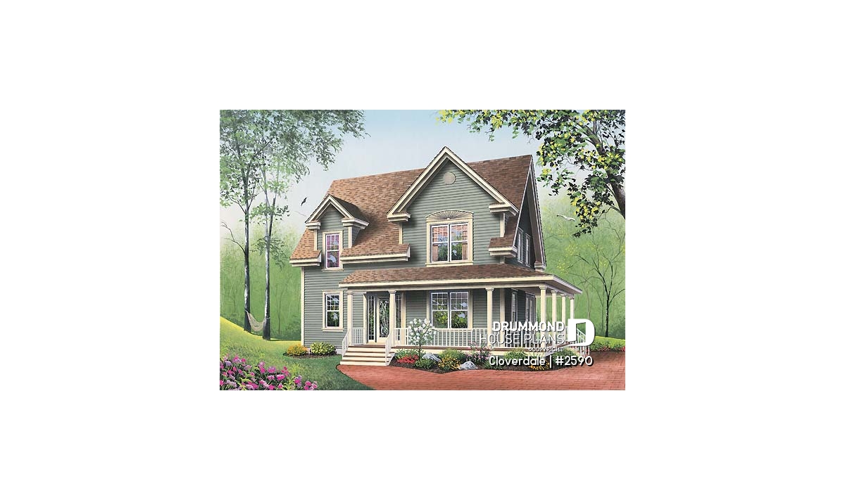 Simple and asymmetric lines, an imposing dormer and a more demure second dormer, help to accent a wraparound porch. The end result is an attractive and inviting home.