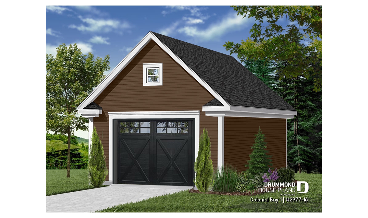 This single car garage is simple, yet functional with the added bonus of storage space above. Decorative moldings add charm and windows on both ends allow daylight into the storage area.