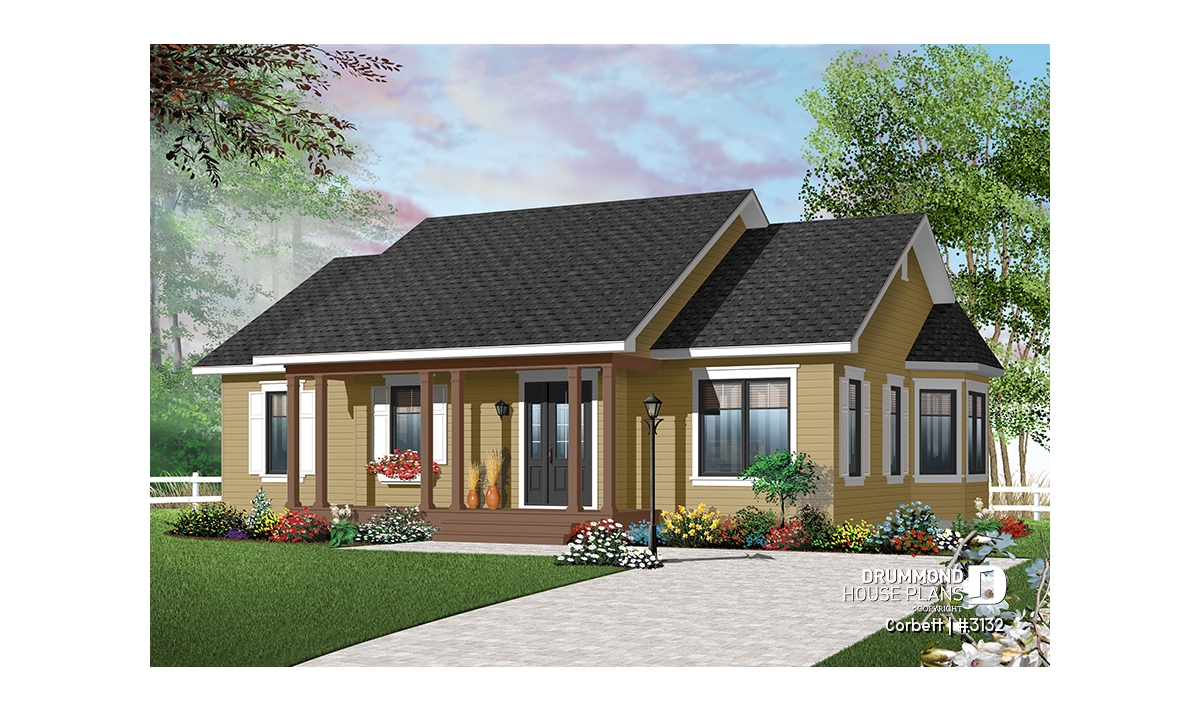 A generous covered porch with a trio of pillar sets provides a unique entry to this open plan bungalow. While open, the activities areas have very distinct spaces thanks to a three-sided bumpout for the dining area, creating a solarium like feeling. An L-shaped kitchen with island provides great storage and work areas as well as a social space.