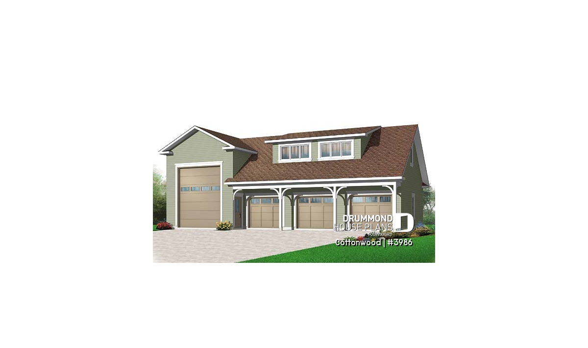 Three deep auto bays plus an RV or truck bay will keep all of your favourite vehicles safe and dry. This RV garage plan features 1697 square feet on the main level and 751 square feet of storage above. An over-sized shed dormer provides light and openness to the upper level and could be modified to suit a business office or studio.