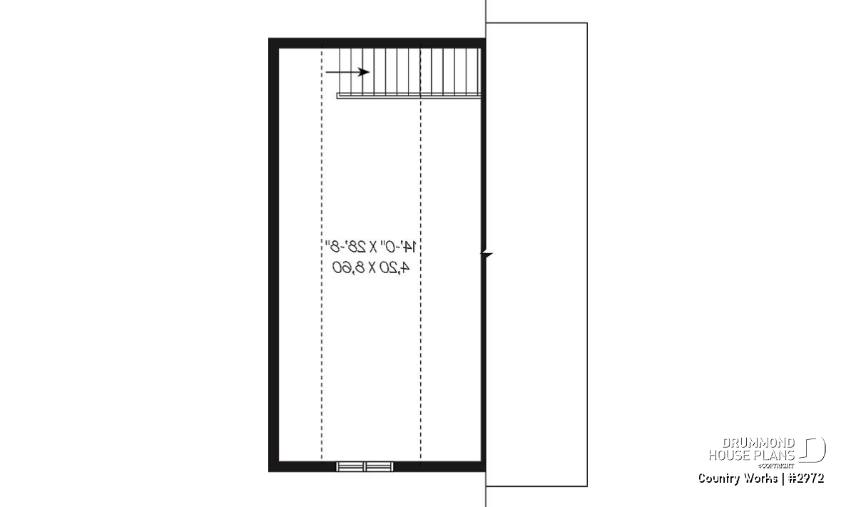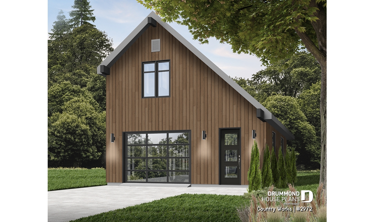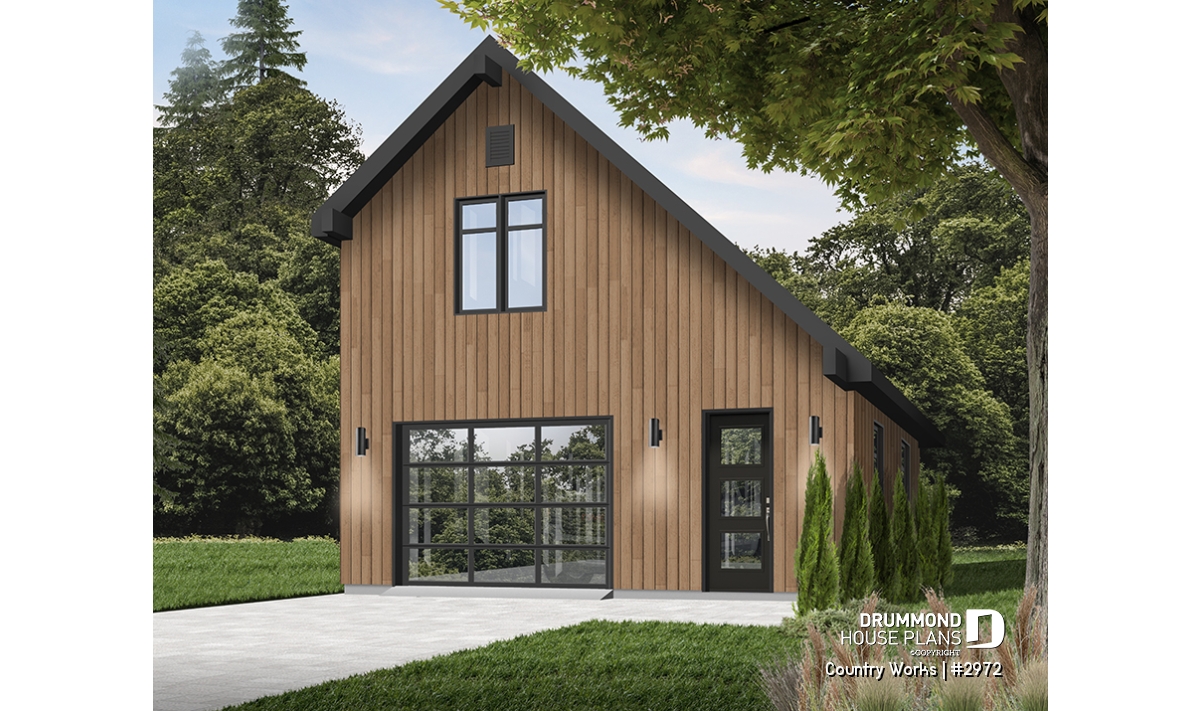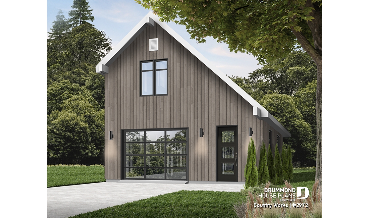 1-car garage plan, Modern barn style, bonus room on second floor