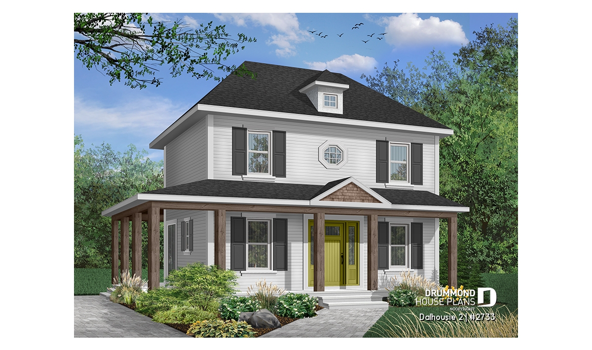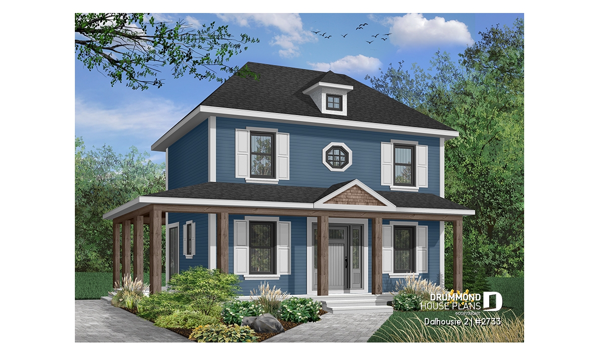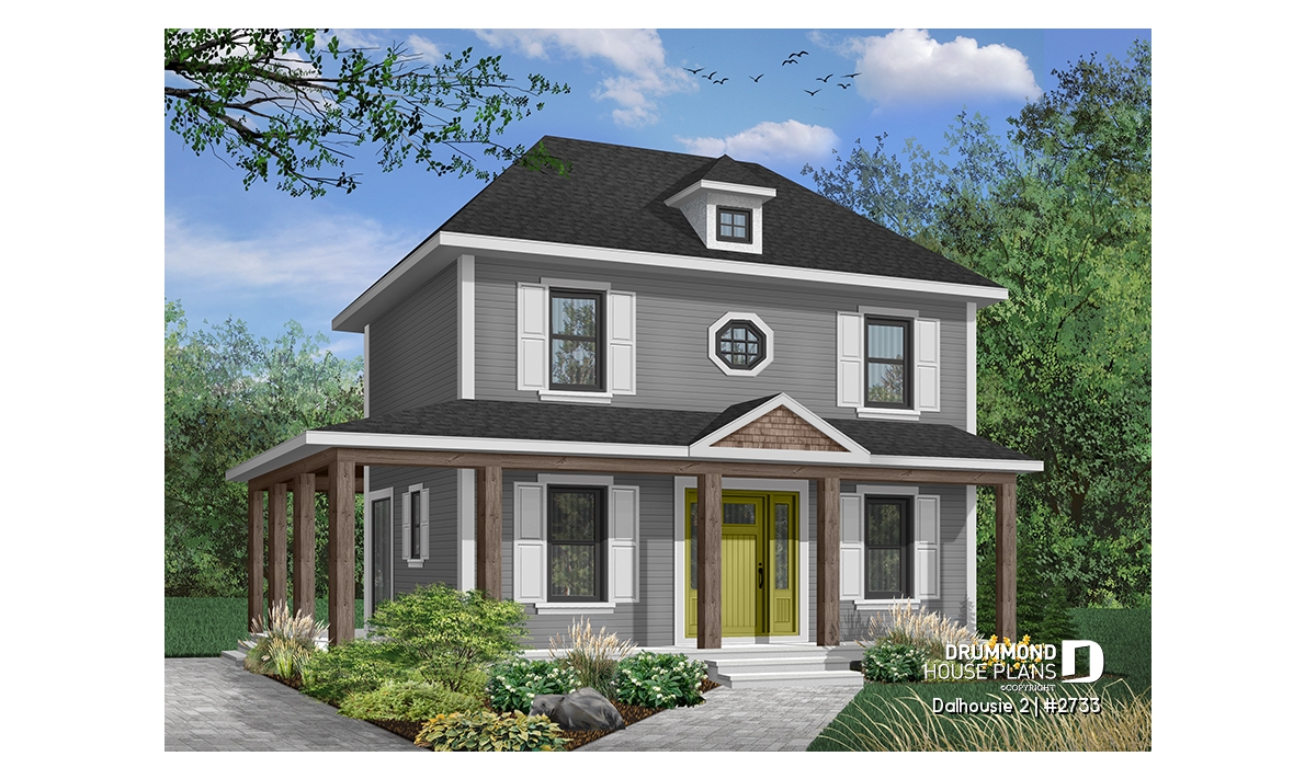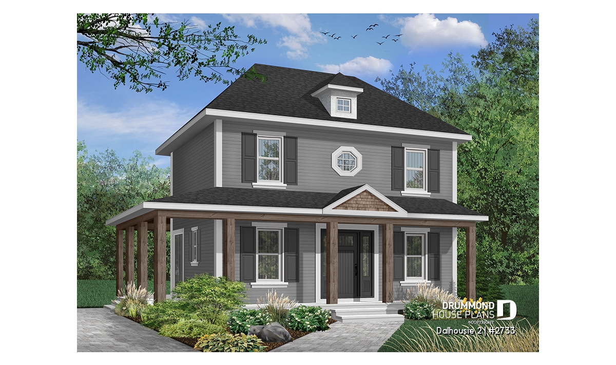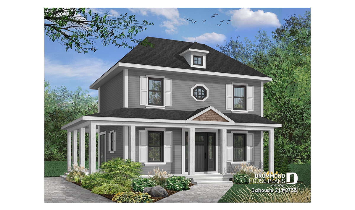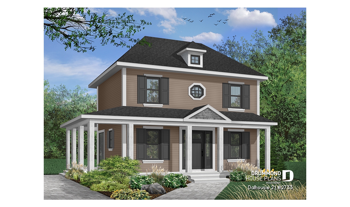 A wraparound porch softens the height of this nearly square footprint providing protection from direct summer sun. Shuttered symmetrical windows, special accent window and dormer add further to the grace of this home.