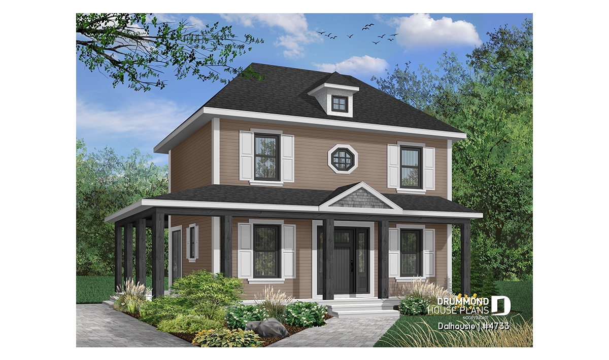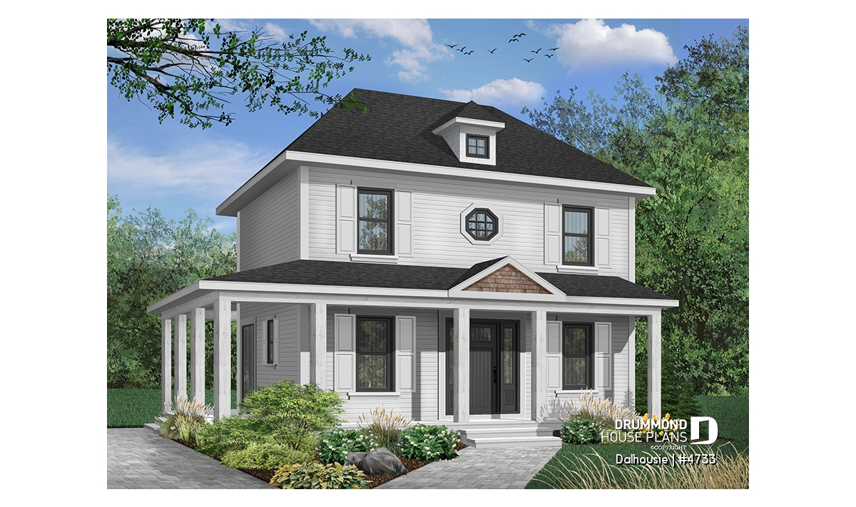 A wraparound porch softens the height of this nearly square footprint providing protection from direct summer sun. Shuttered symmetrical windows, special accent window and dormer add further to the grace of this home.
