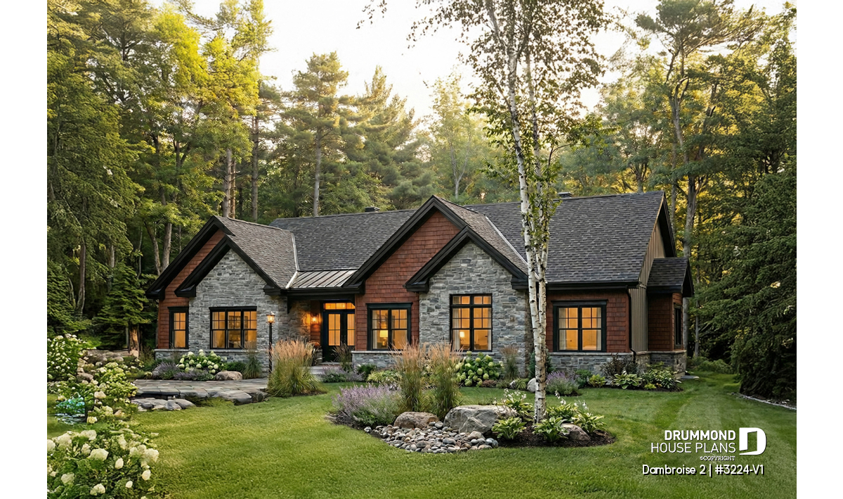 The Dambroise 2 (#3224-V1) is a stunning modern rustic bungalow house plan designed to offer both comfort and versatility, with a total of 2,016 sq. ft. on the main floor and an additional 2,016 sq. ft. basement ready to be customized to your needs.