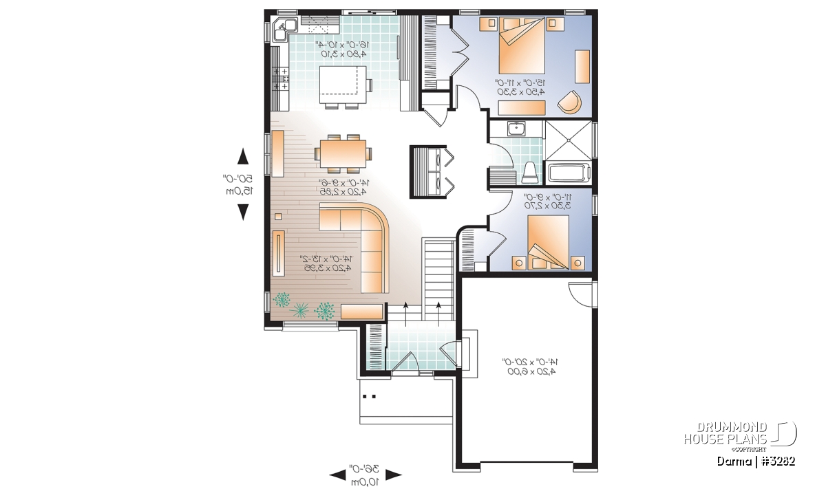 Contemporary house plan with garage, open floor plan, large kitchen island, laundry on main floor. Entirely open activities area. Main entrance garage service entrance with adjoining closet. Outstanding kitchen with lots of storage, central island, lunch bar and patio doors overlooking the rear. Two large bedrooms with walk-in closets and easy accommodation of a double bed. Bathroom with combo bath / shower 5 feet x 7 feet. 14 ft. x 20 ft. garage (interior dimensions).
