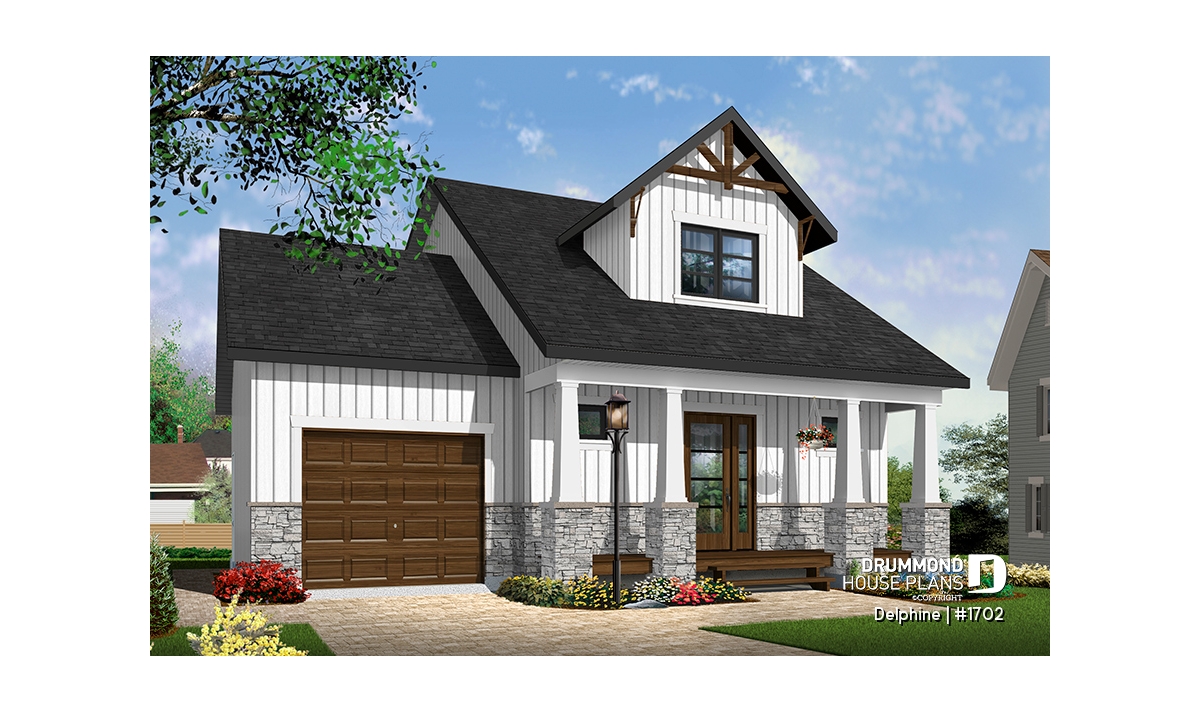 A combination of stonework, columns and trim with a large, covered porch give this "right-sized", new plan character and a rustic modern style that is sure to please!
