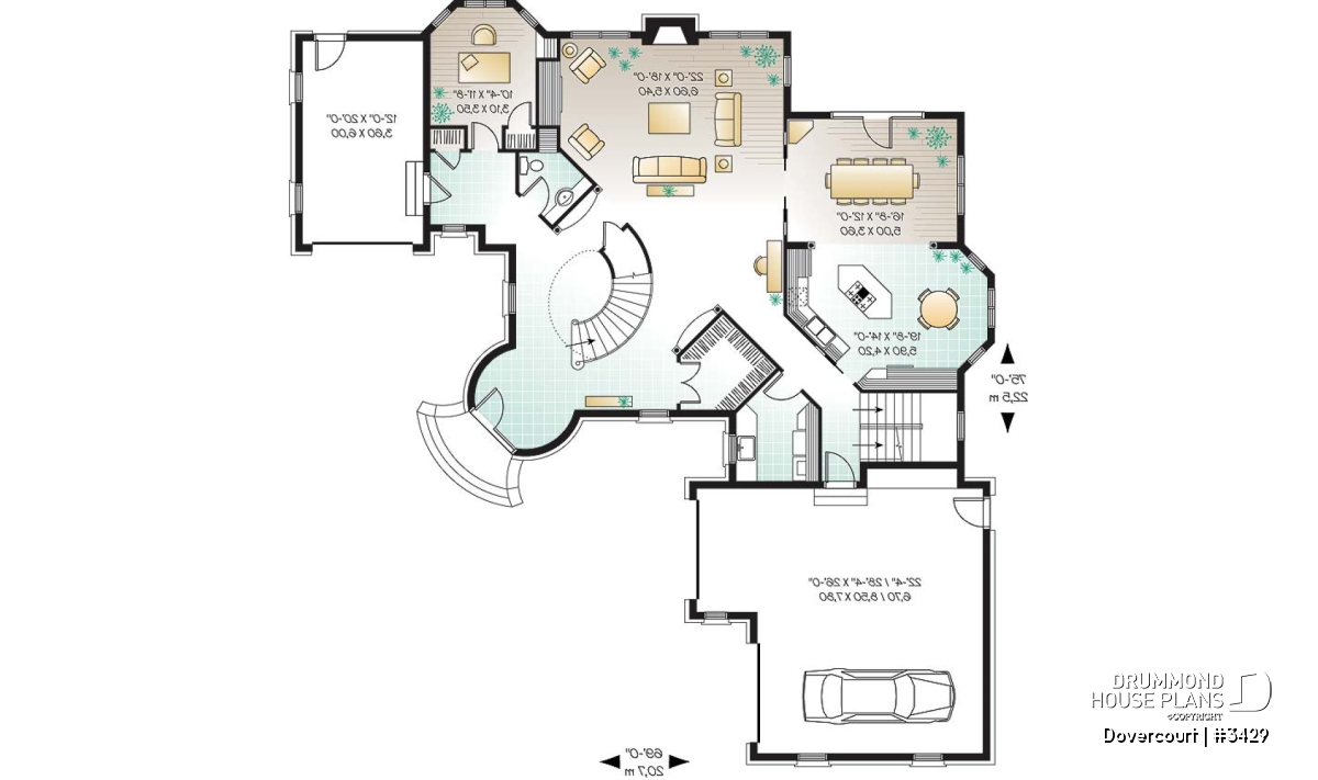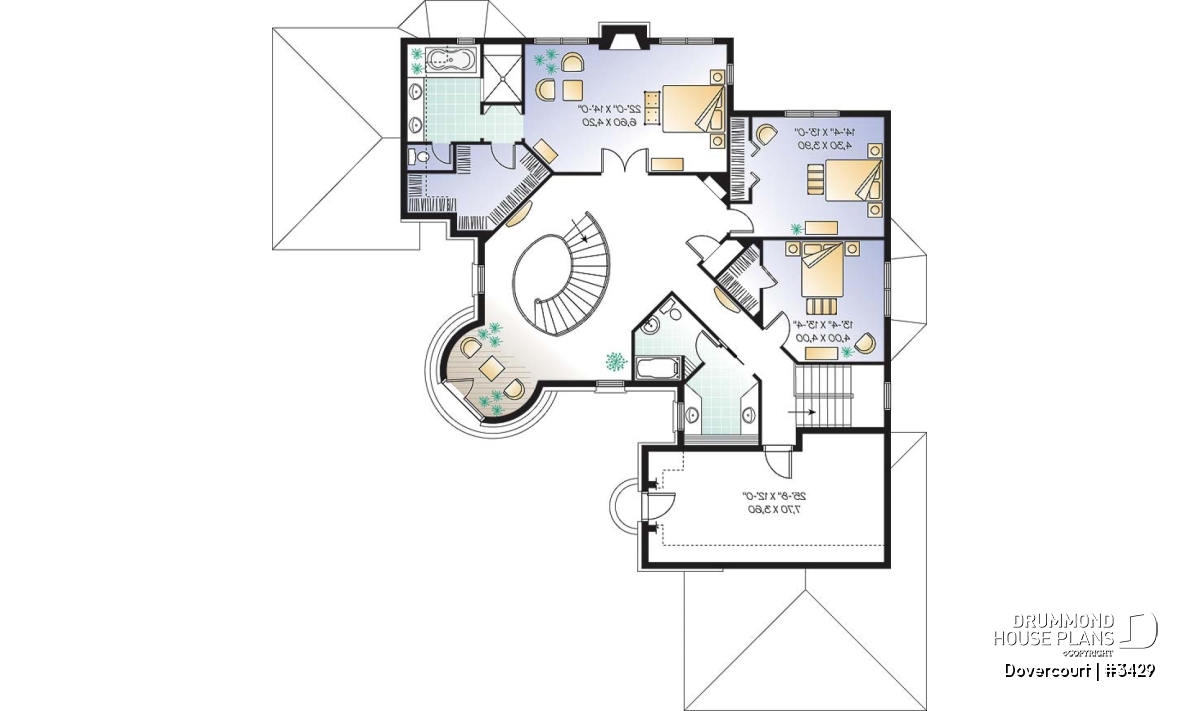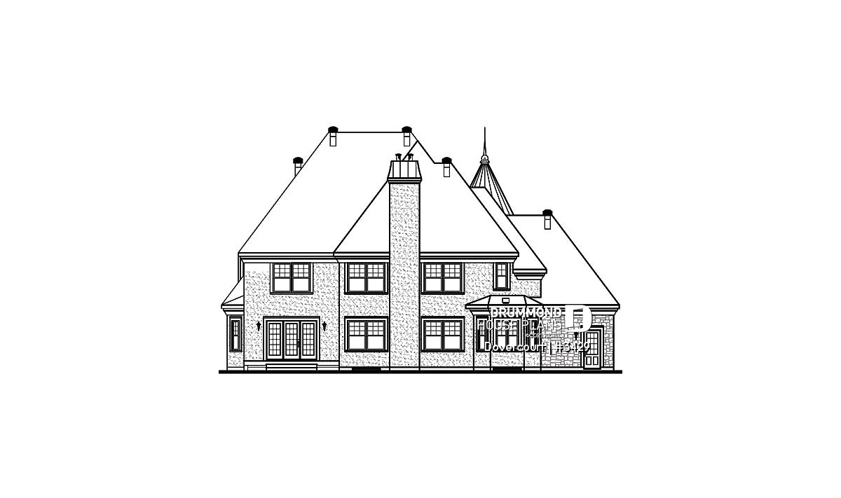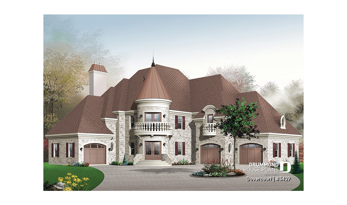 This dreamy castle-inspired house plan features a dramatic turret-style entry, two delicate balconies and clever flanking garage arrangement.