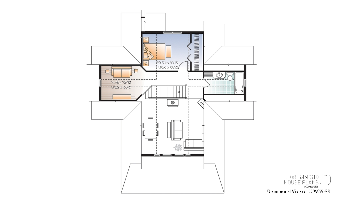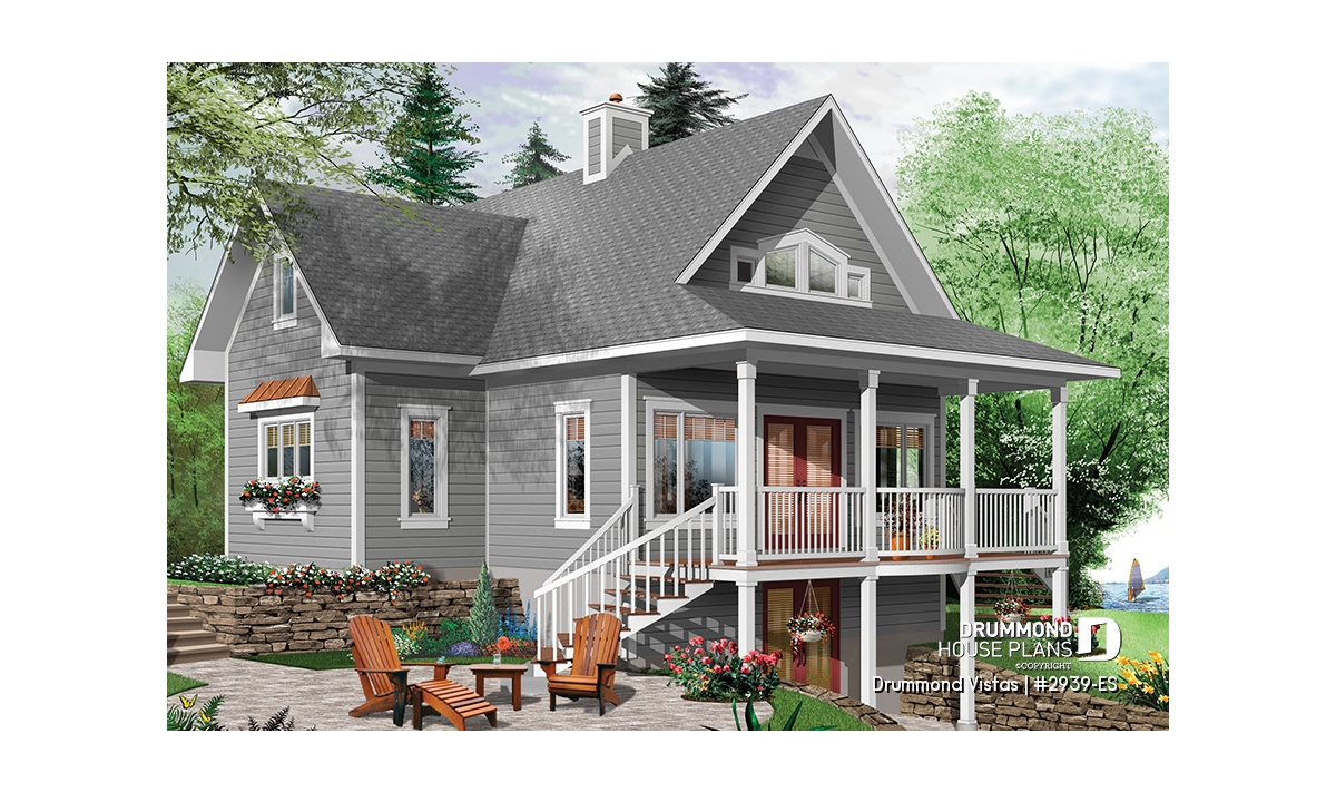 In order to allow you to age well with your cottage, this plan 2939-ES (Drummond Vistas) is designed for daily living on the main level. Thus, you will enjoy a mudroom at the front entrance, a kitchen with island, a dining room paired with a living room with cathedral ceiling and space for a stove or fireplace. Not to mention a master suite with private shower room and a washer-dryer area nearby. A small full powder room, practical for guests, perfectly completes this floor.