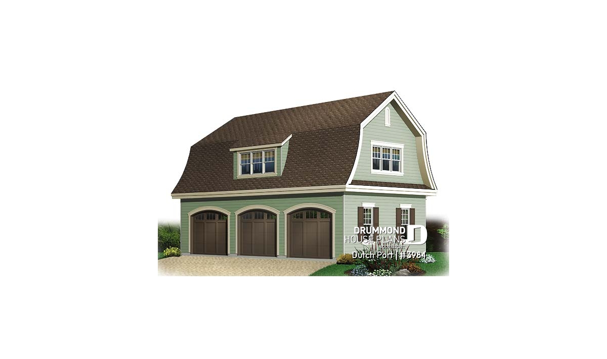 The gambrel roof of this 3-bay garage make it a popular model when a country feeling is being sought. Three bays with graceful arched doors are balanced by a shed dormer. 804 sq ft of garage and 594 sq. ft. of bonus space can be developed as desired.