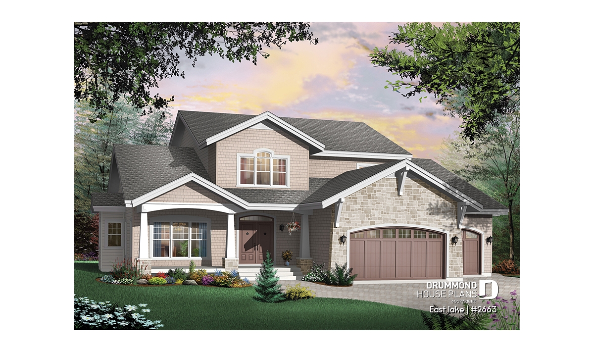 A trio of forward facing gables and pillared porch grace the front of this beautiful craftsman home.