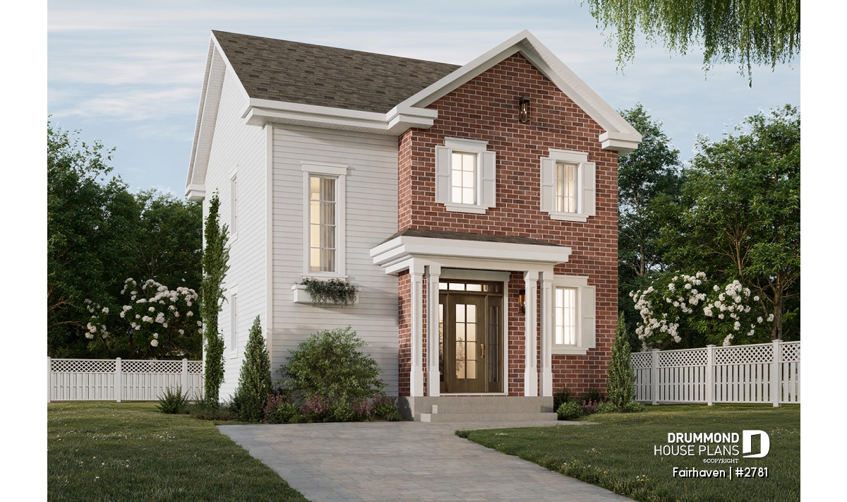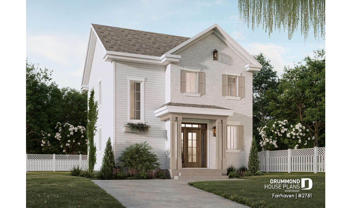 Two-story house plan inspired by English cottage style.