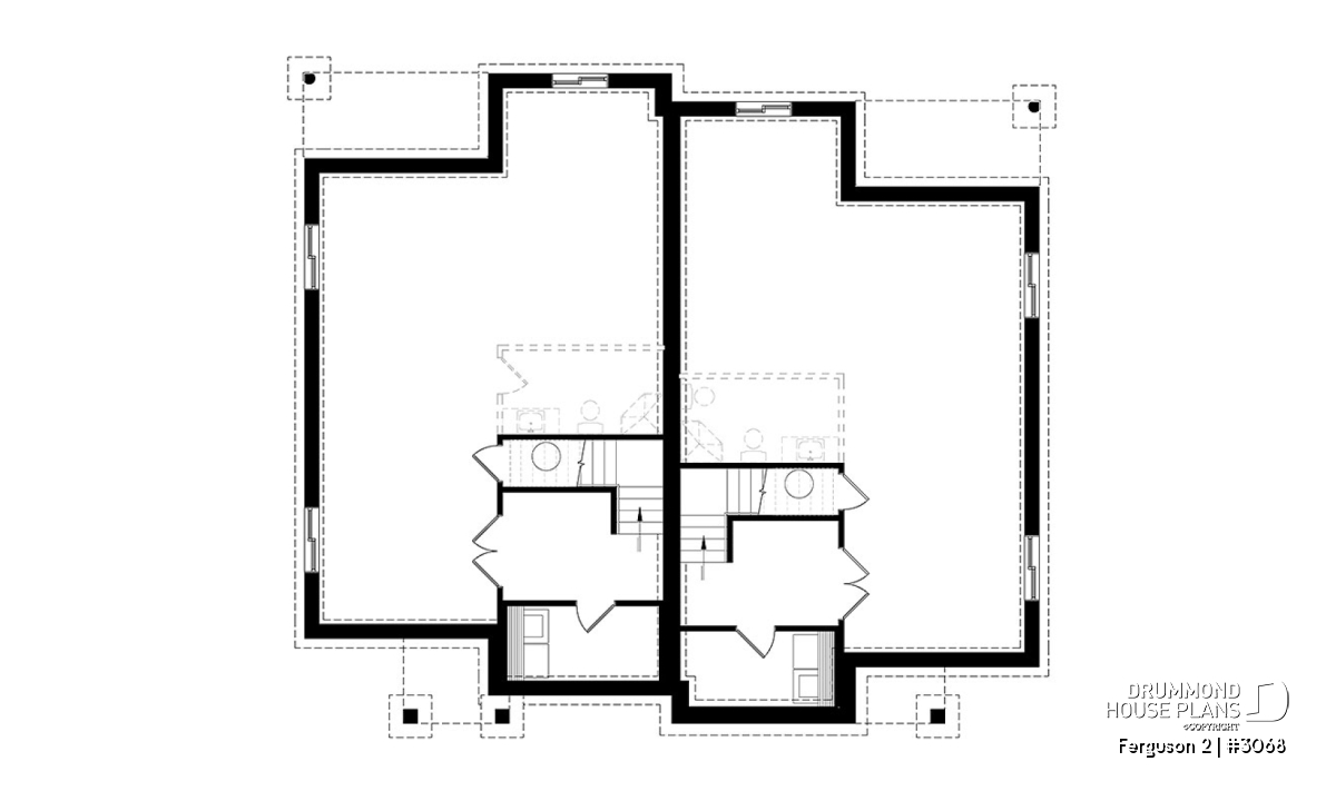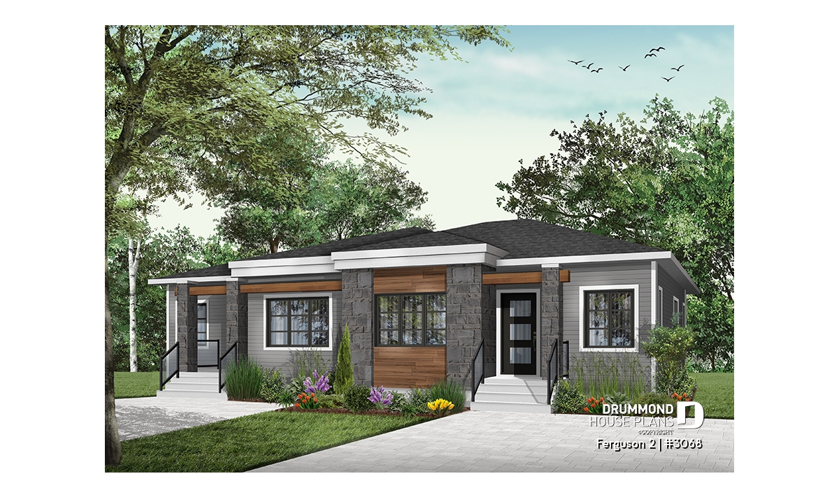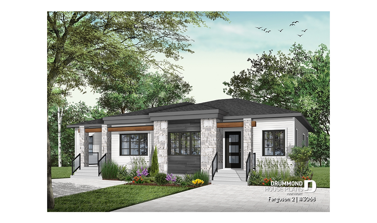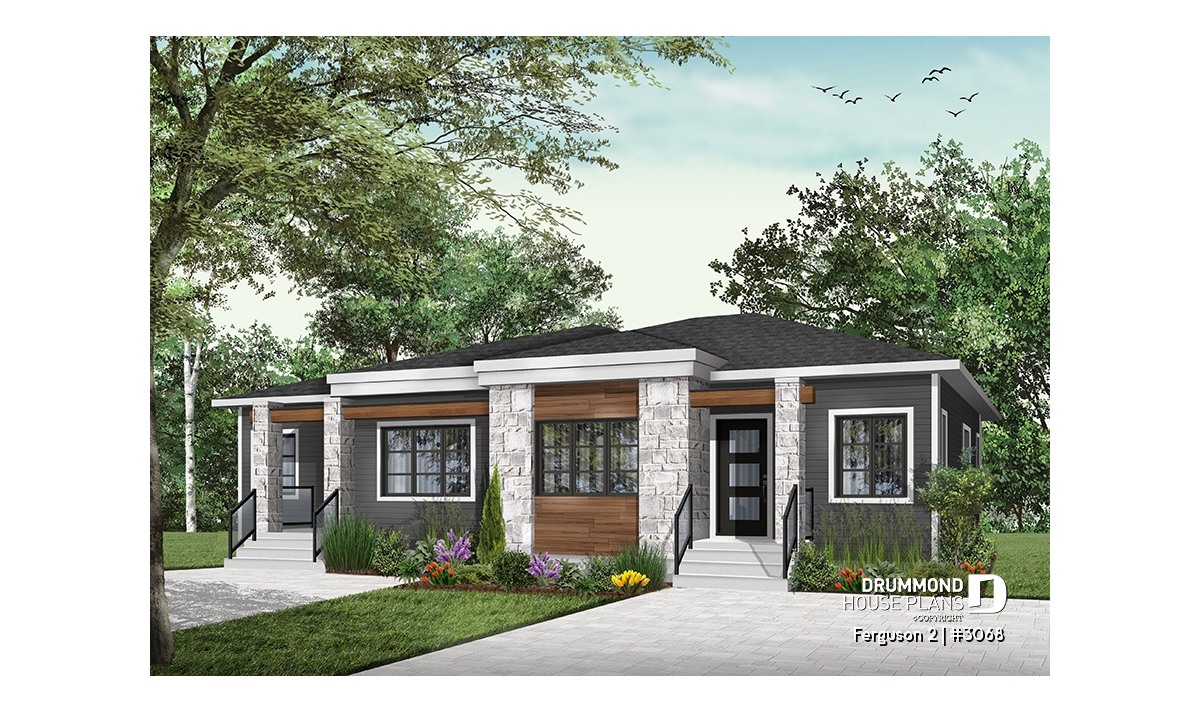 Here is our new contemporary style duplex house plan, the new Plan # 3068 from Drummond House Plans, offering you beautiful spaces and potential in the basement for the future! The Ferguson 2 duplex model, which is a derivative of plan # 3067, offers an unfinished daylight basement to finished as you desire, and a single large family bathroom on the ground floor instead of two as its basic model. This version # 3068 of the basic model was designed for couples or families wishing to use the basement space to add bedrooms or a family room, a low costs. It should be noted that the ceiling of the ground floor is 9 feet everywhere, which gives significant amplitude to the rooms.