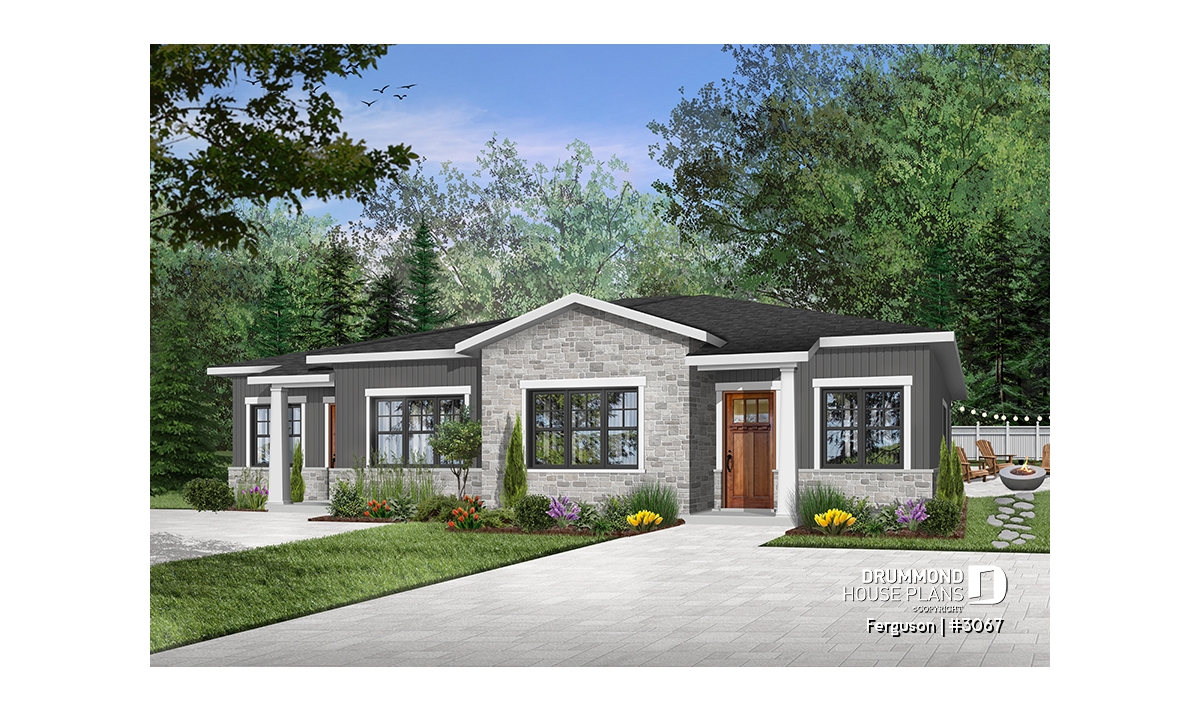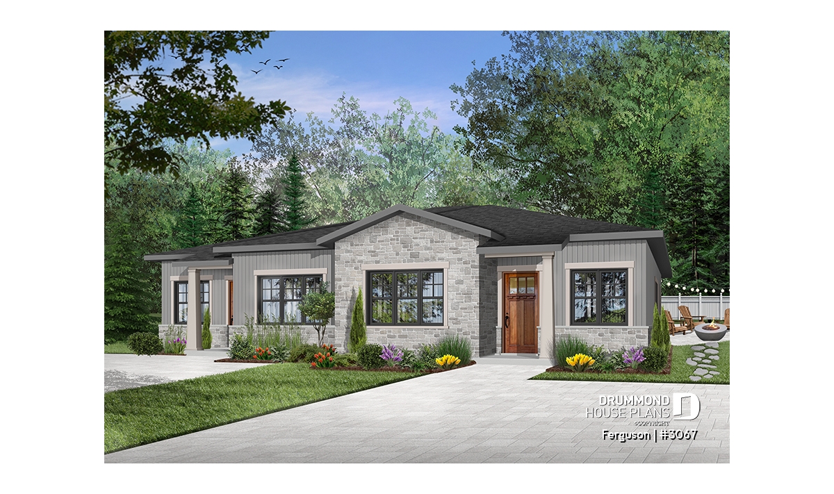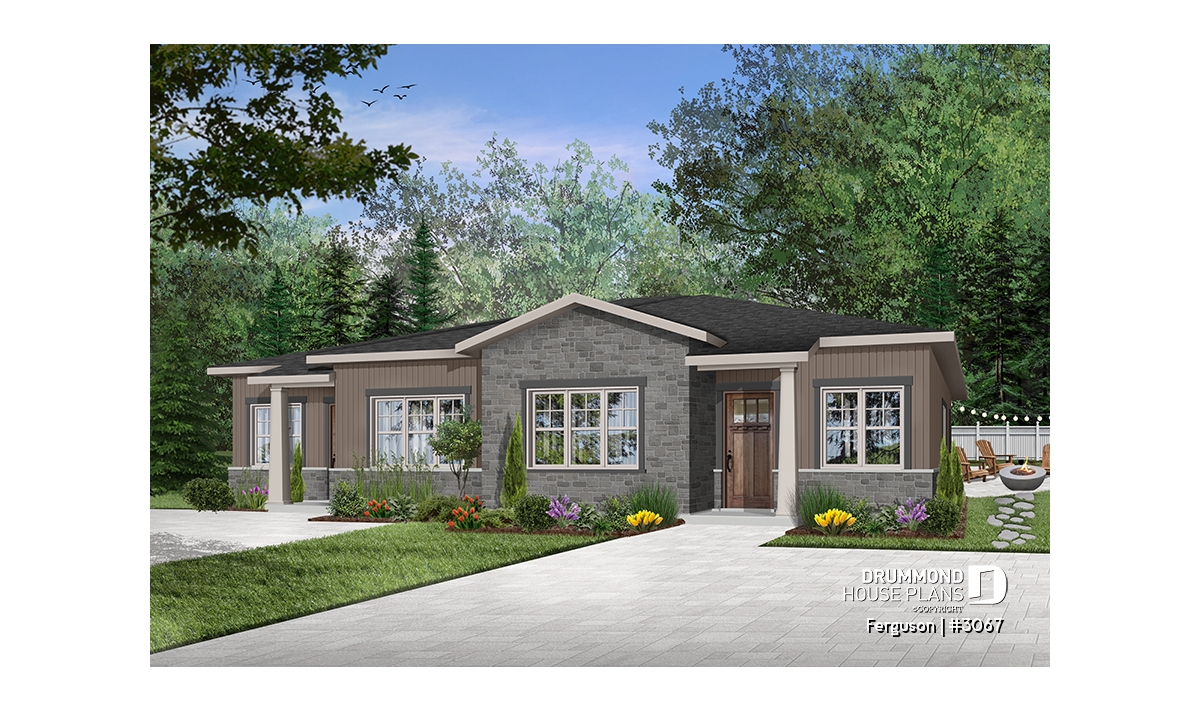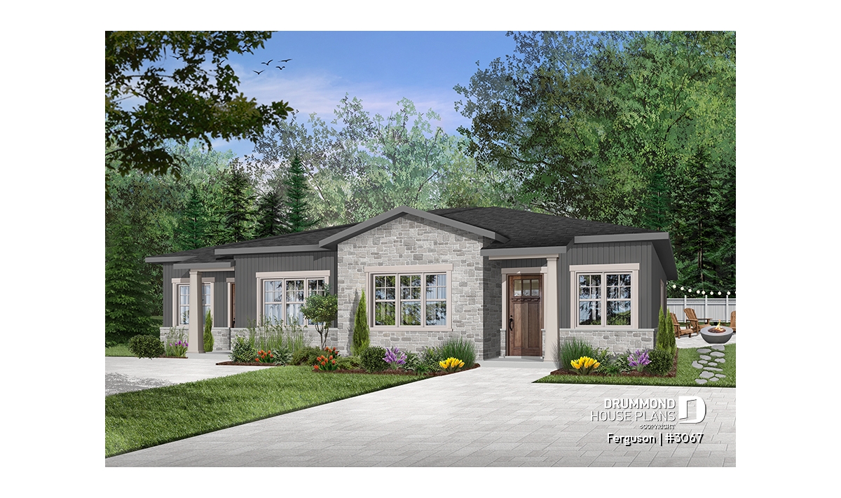 Here is an American-style duplex home design, our new duplex plan # 3067 by Drummond House Plans, offering you beautiful spaces and comfort! The Ferguson duplex home plan was designed for a couple or a family wishing to have no basement which allowed us to use the space that would have been reserved for a staircase (leading to the basement) and maximize the overall square footage. It should be noted that the ceiling height of the entire main floor is 9 feet high, which gives significant amplitude to the rooms.