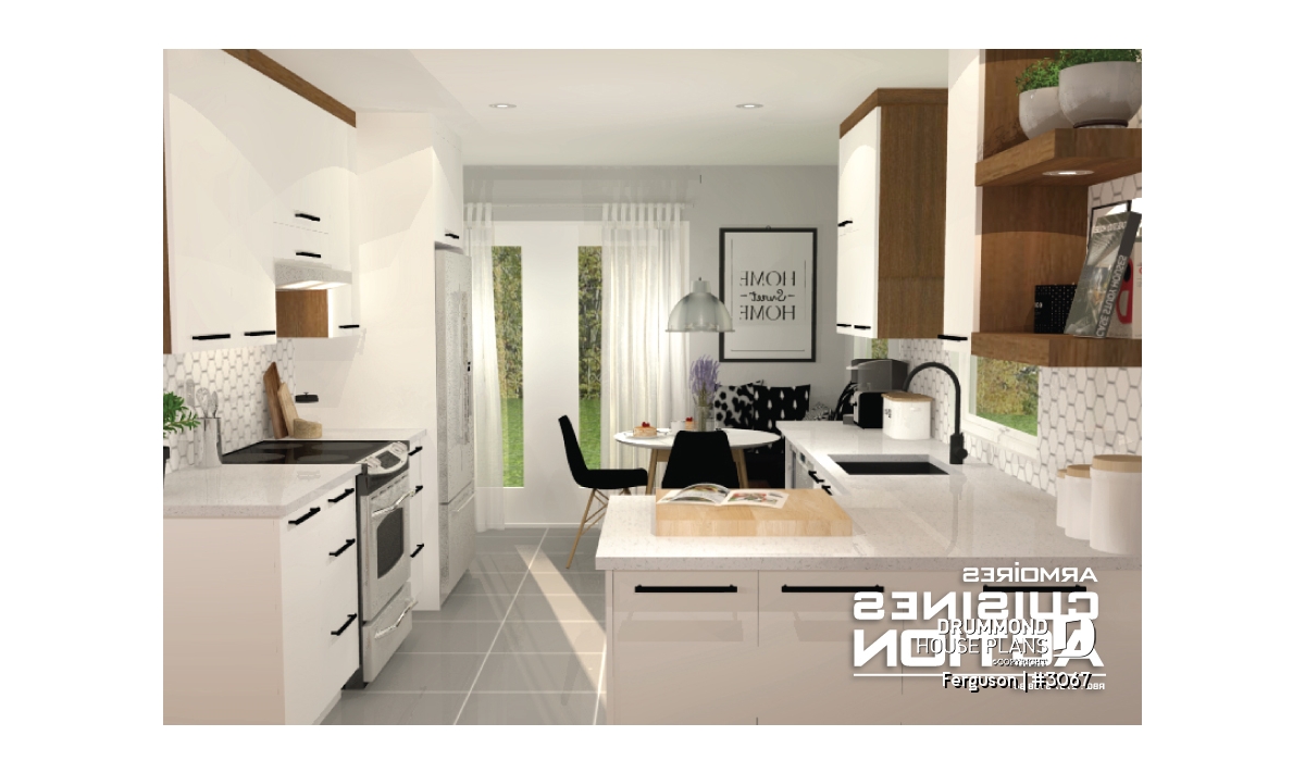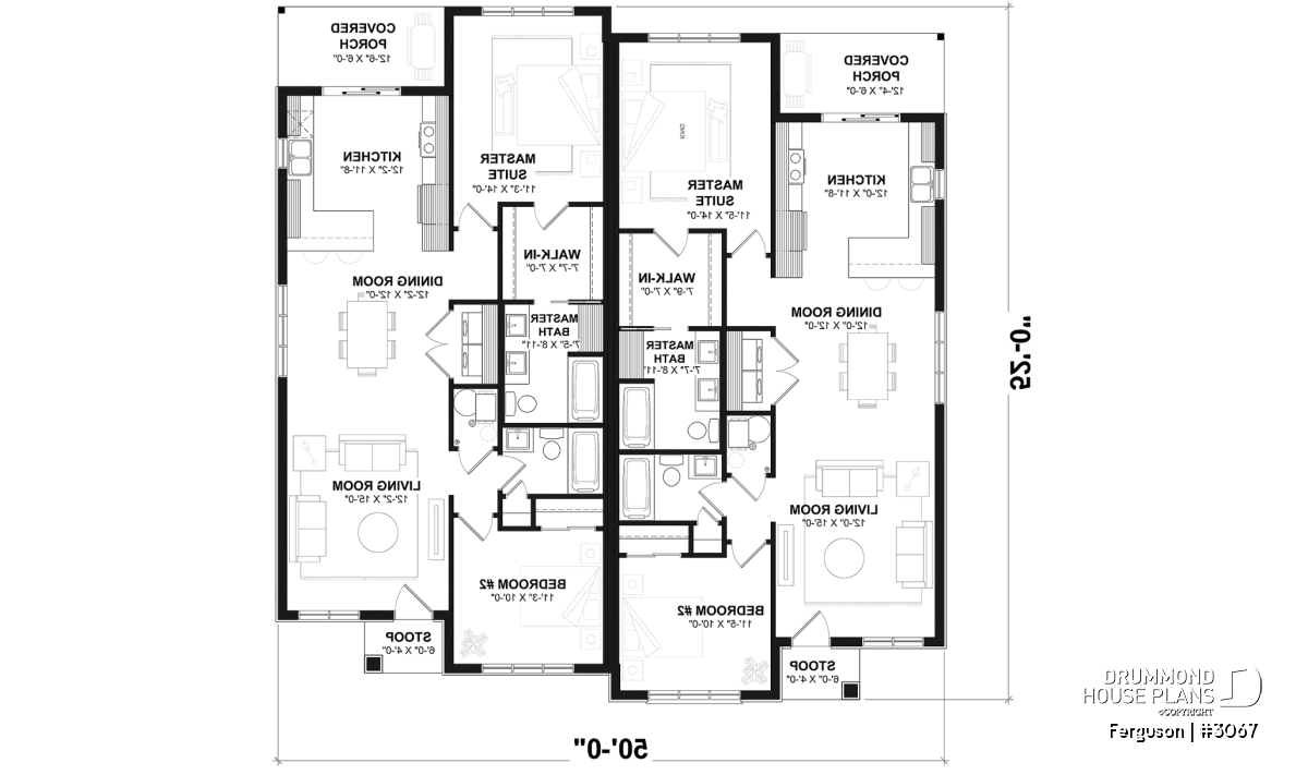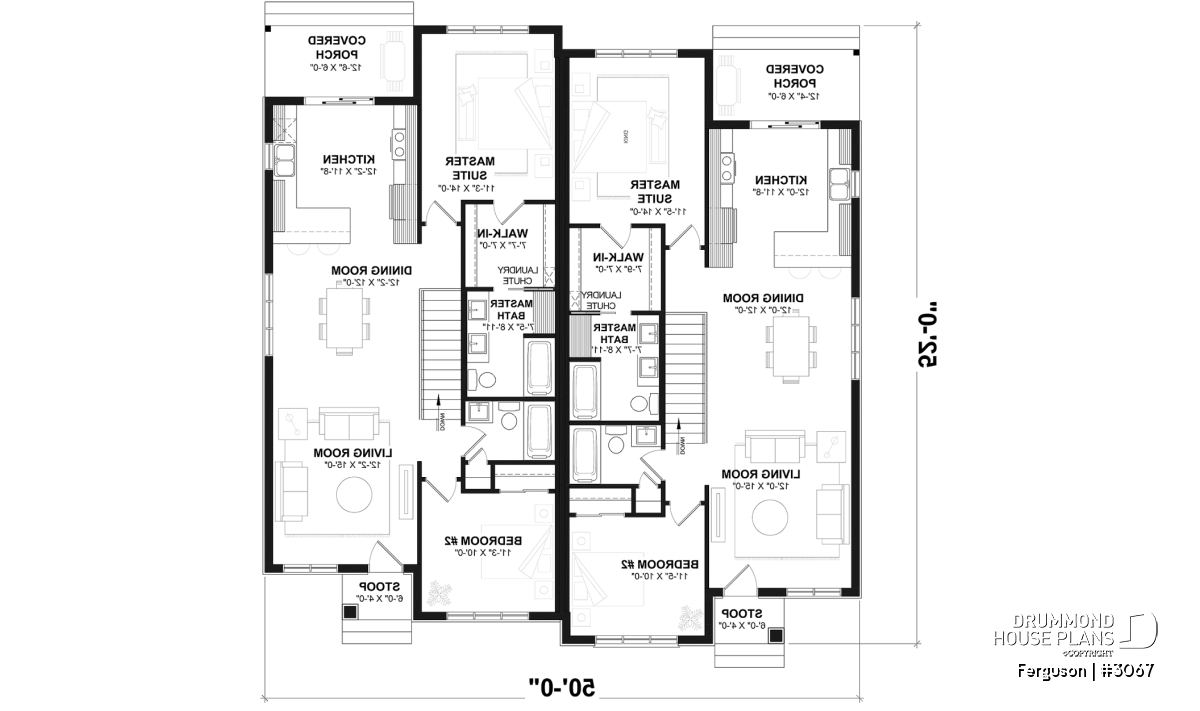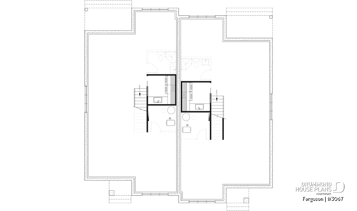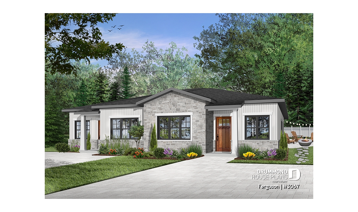 Here is an American-style duplex home design, our new duplex plan # 3067 by Drummond House Plans, offering you beautiful spaces and comfort! The Ferguson duplex home plan was designed for a couple or a family wishing to have no basement which allowed us to use the space that would have been reserved for a staircase (leading to the basement) and maximize the overall square footage. It should be noted that the ceiling height of the entire main floor is 9 feet high, which gives significant amplitude to the rooms.