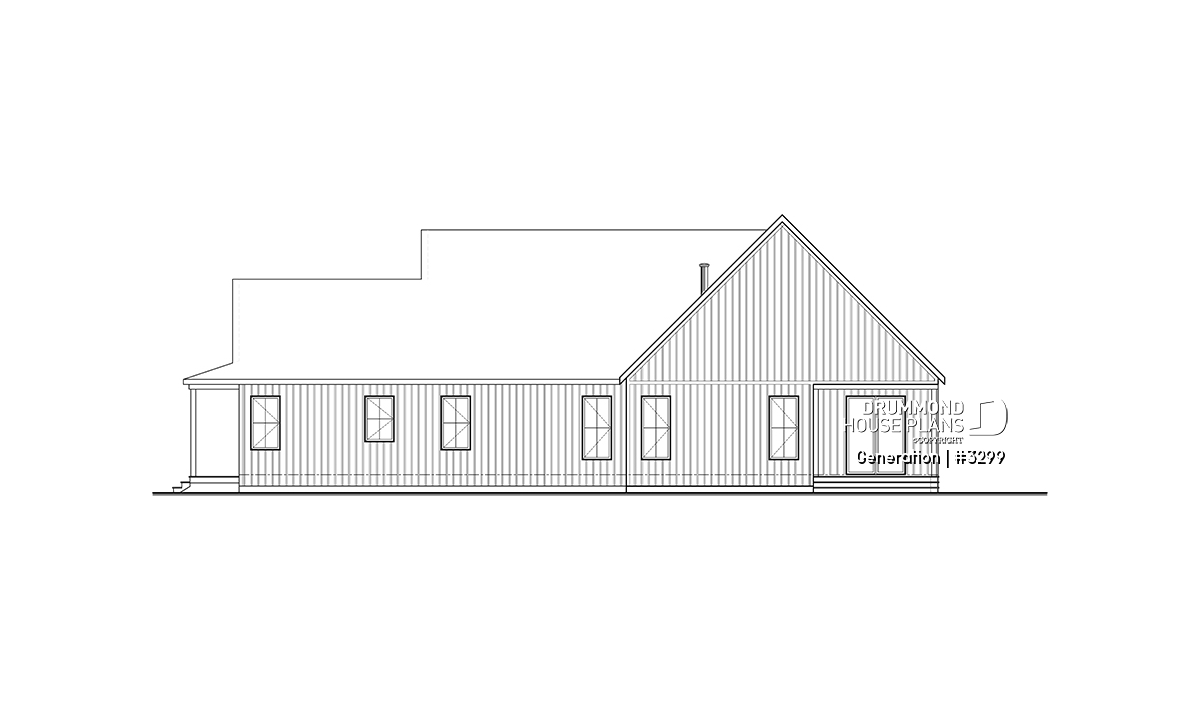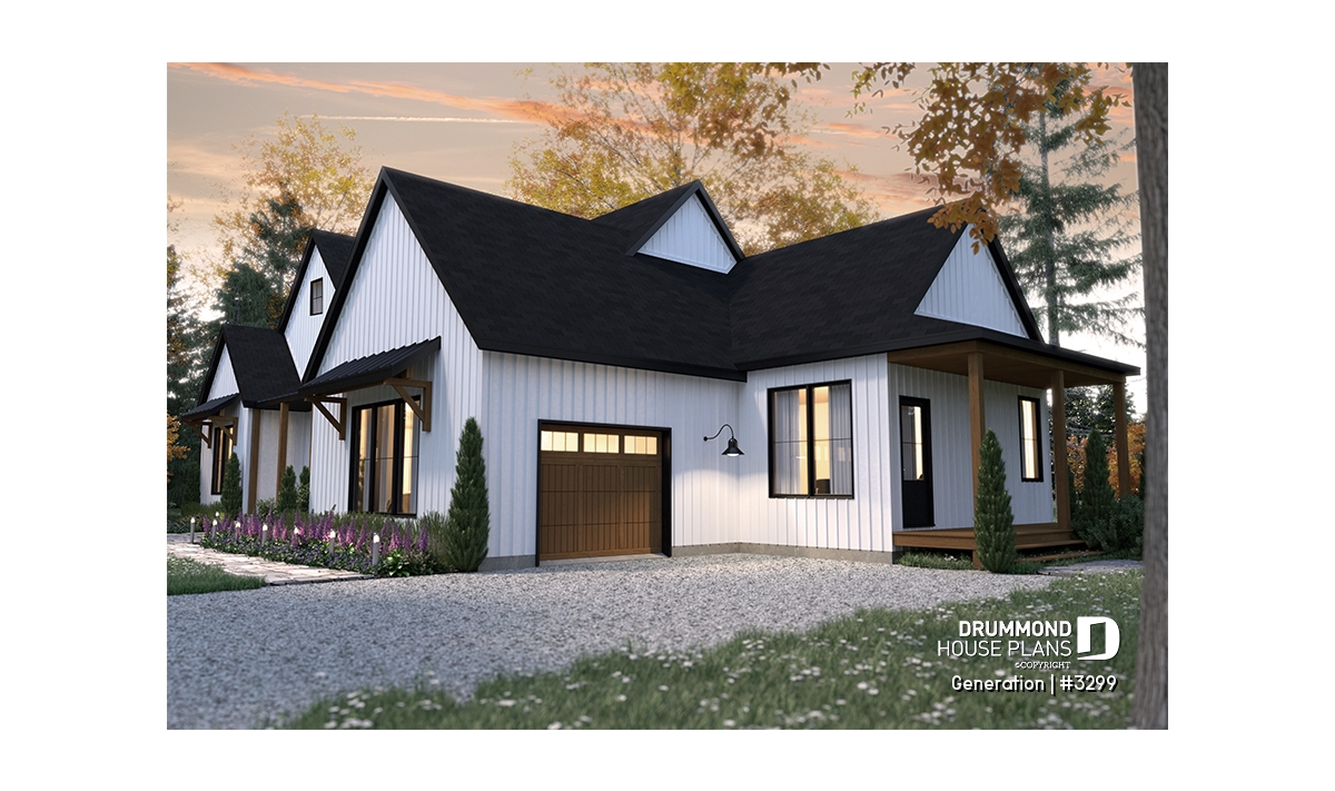 The intergenerational house plan GENERATION (# 3299) features 1306 sq.ft. in the main unit (on the right) and 680 sq.ft. on unit #2 (left). The exterior spaces of the two dwellings are opposite one another, thus allowing the occupants to experience daily privacy.