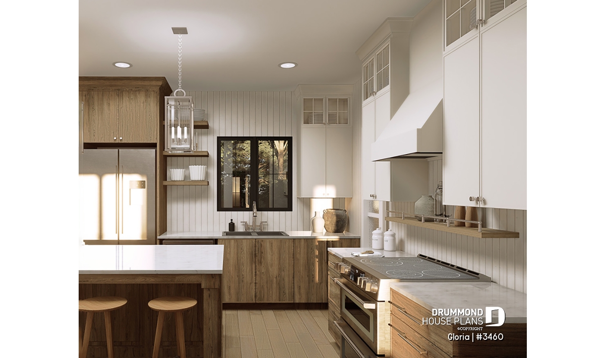 Welcome to the ground floor for which a large walk-in coat closet, at the front entrance, will certainly suit the owners as well as this well-defined and easy-to-arrange living room. Here, an office space is planned very close to the front entrance while at the back of the house we find a kitchen with a central island open to a dining room full of light as well as a beautiful laundry room and half bath on the same floor.