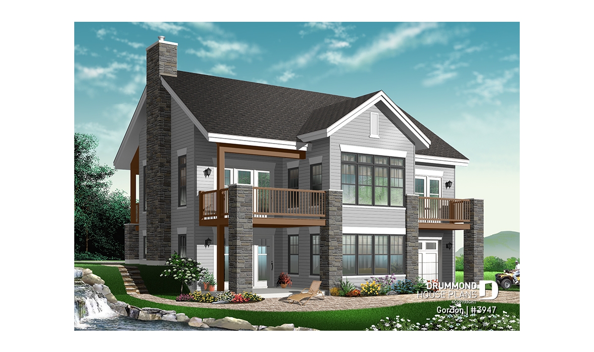 Covered gallery in the front as well as in the back of the house. Balcony in bedroom 1. 9' ceiling on the first level and cathedral ceiling in the living room. Island in the kitchen. Fireplace in the living room. Four bedrooms, two of which are in the basement in order to maximize the bedroom space. Partly covered terrace, facing the living room and covered patio facing the computer area in the basement. Interesting garage with access to the rear by way of providing excellent storage space for recreative equipment.