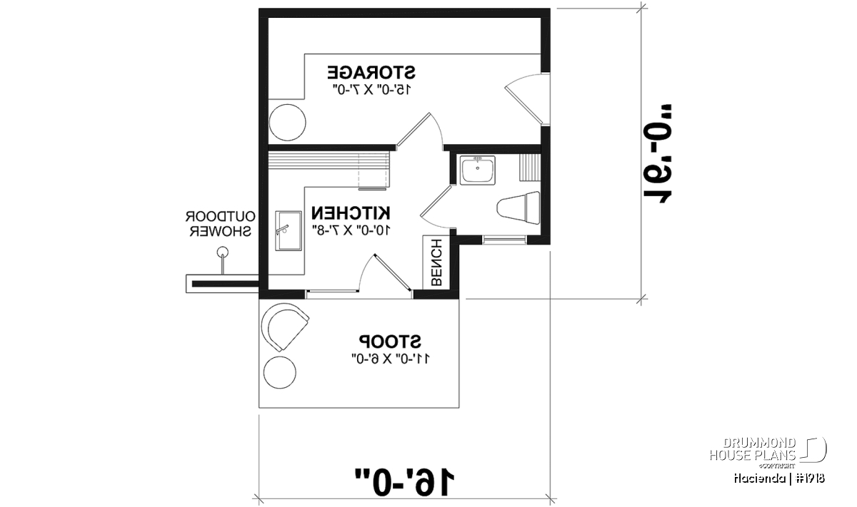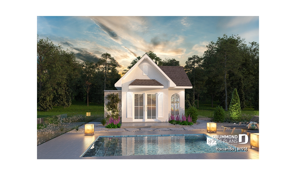 The HACIENDA pool house plan (#1918) offers a warm, rustic-inspired design that blends comfort and practicality for everyday outdoor living. With a compact yet efficient 16' x 16' footprint, this cabana is thoughtfully designed to complement a backyard pool area without overwhelming the landscape.