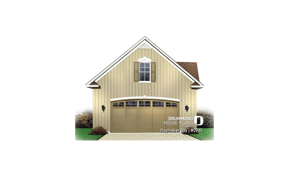 Board and batten cladding, shutters and quality moldings ensure this garage will be a welcome addition to your home.