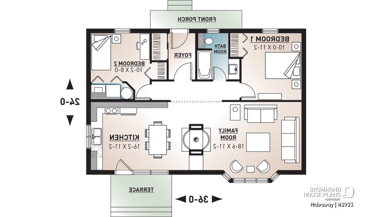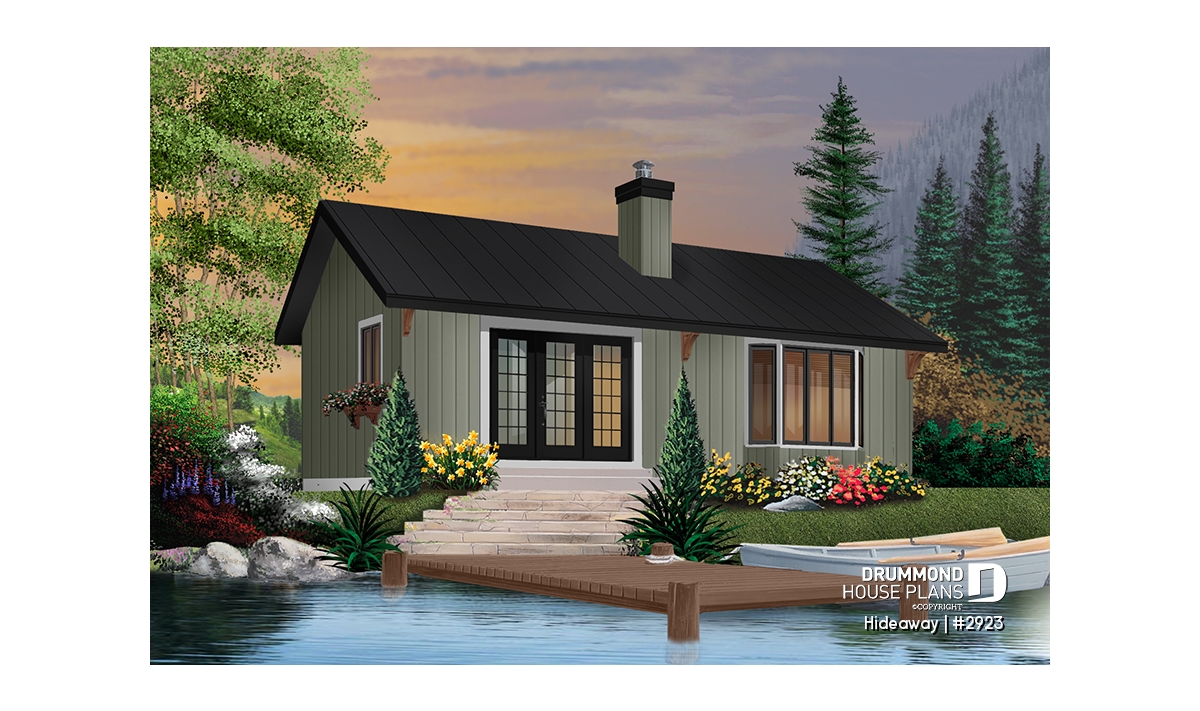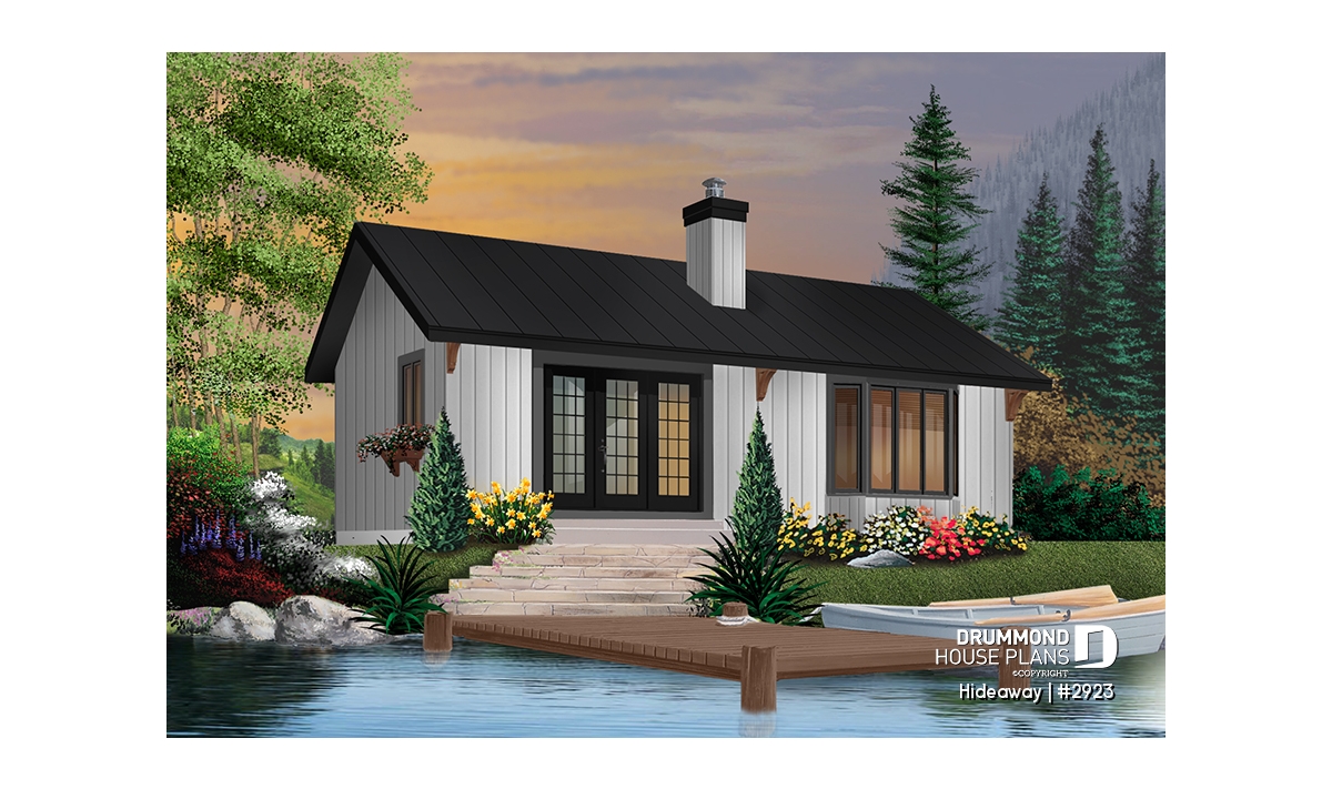A simple two-bedroom cabin with open living area, divided only by a two-sided fireplace is sure to be your recreation haven. Simple construction with timber accents will make this little cabin right at home in the woods or along a stream.