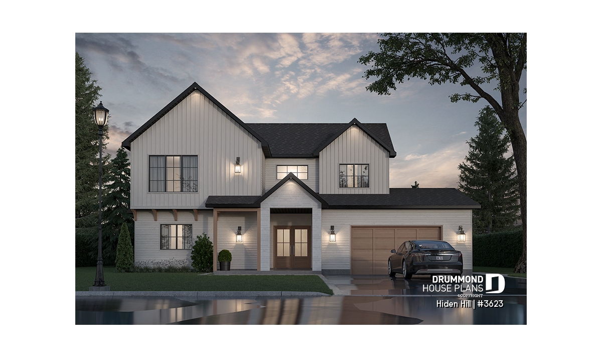 Modern Farmhouse offering some modern architectural elements such as dark windows and the shape of its sheltered front porch.
