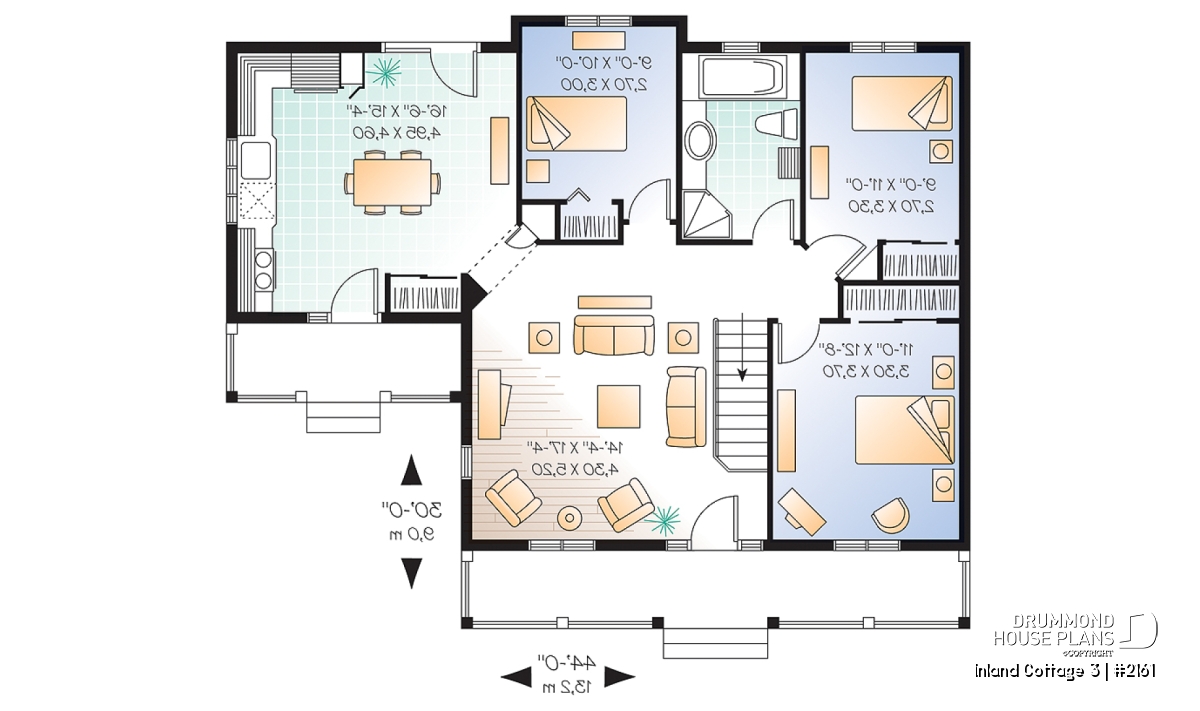 Careful planning allows this tiny bungalow to live large. Three bedrooms and a 4-piece bathroom are configured as to minimize wasteful hall space and maximize living area, resulting in a pleasantly large living room for a house of only 1147 sq. ft.
