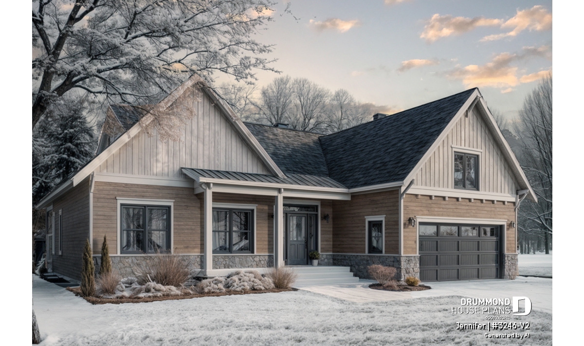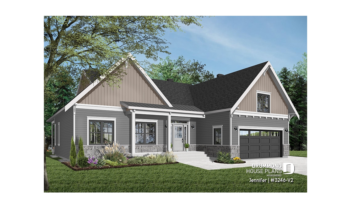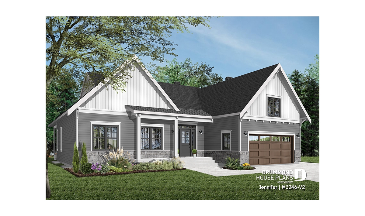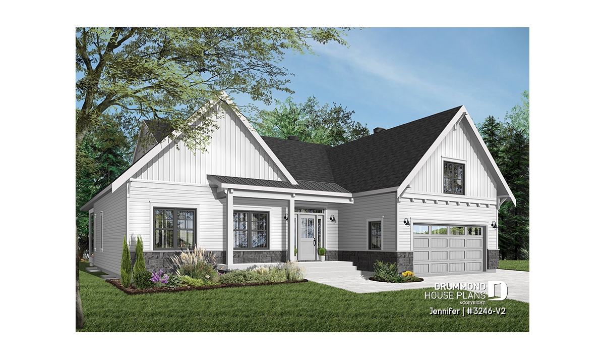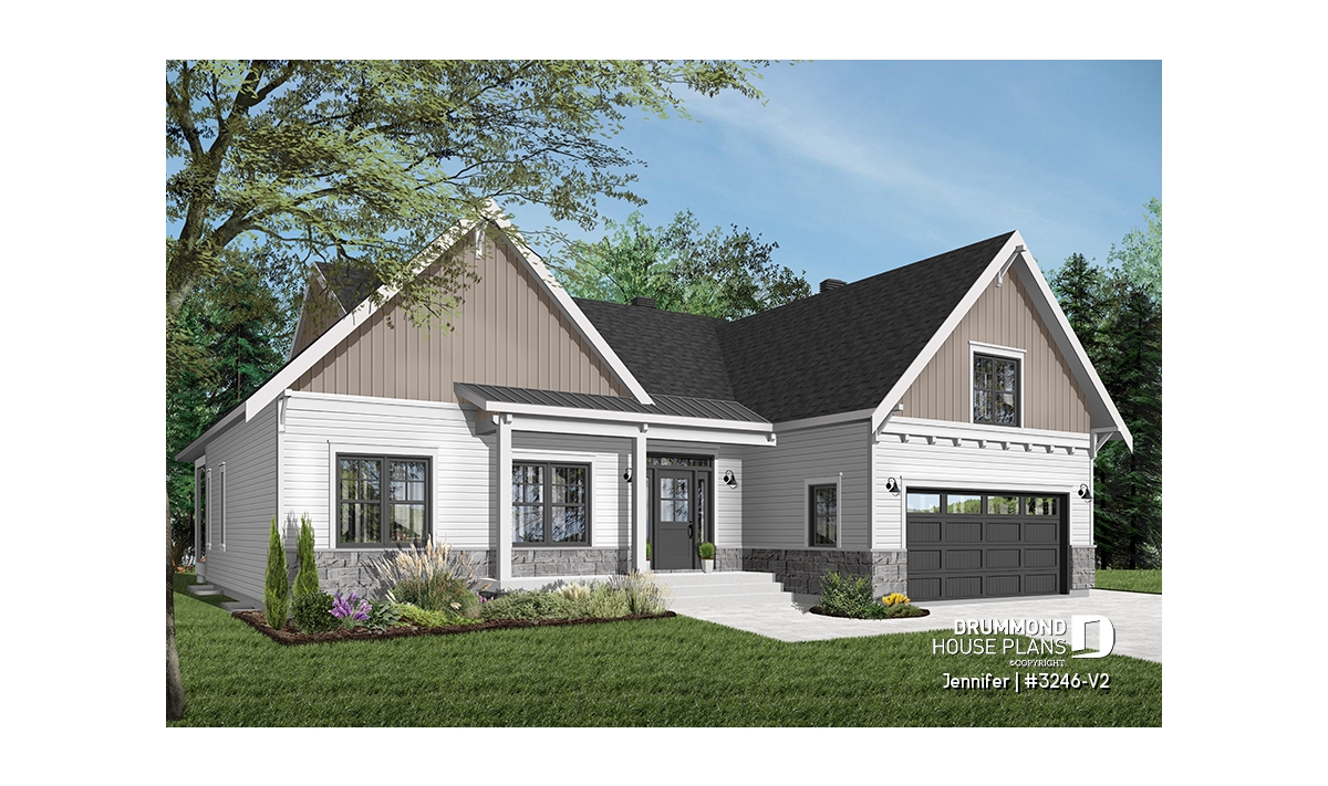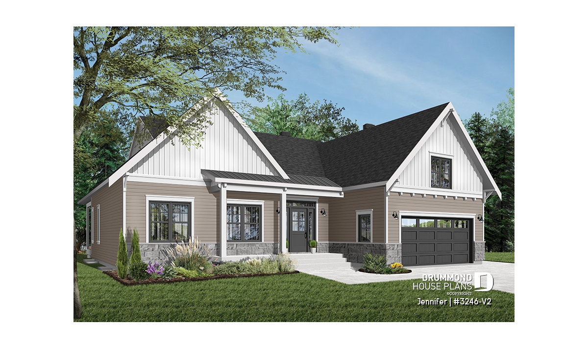 This country style house of one-story with double garage (plan 3246-V2, also named "Jennifer") suggests several most distinctive and interesting elements. The different options of exterior materials and colors suggested for this new house plan are very trendy this year: a touch of stone in the lower part, a partial steel roof and the exterior siding that is suggested horizontally as well as vertically. It should be noted that this house offers much brightness and light due to its large number of fitted windows (see the floor plan for better visualization).