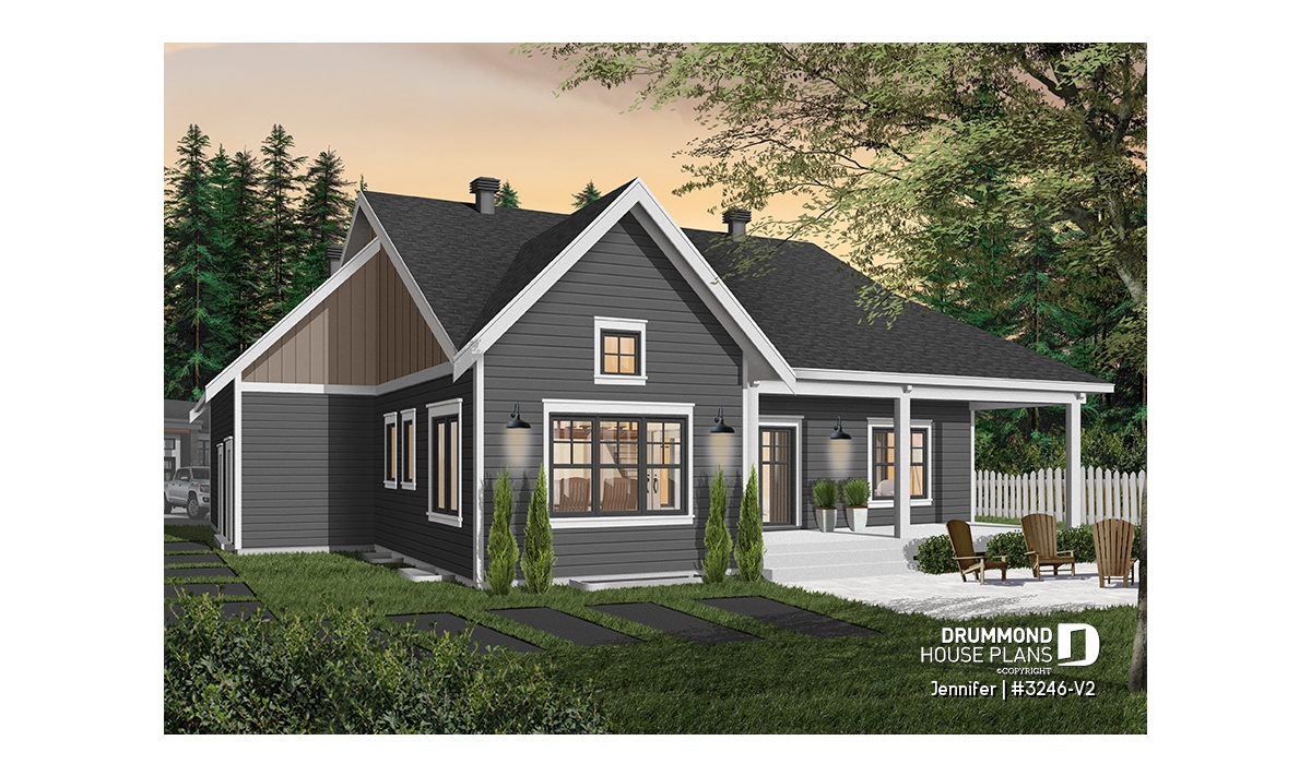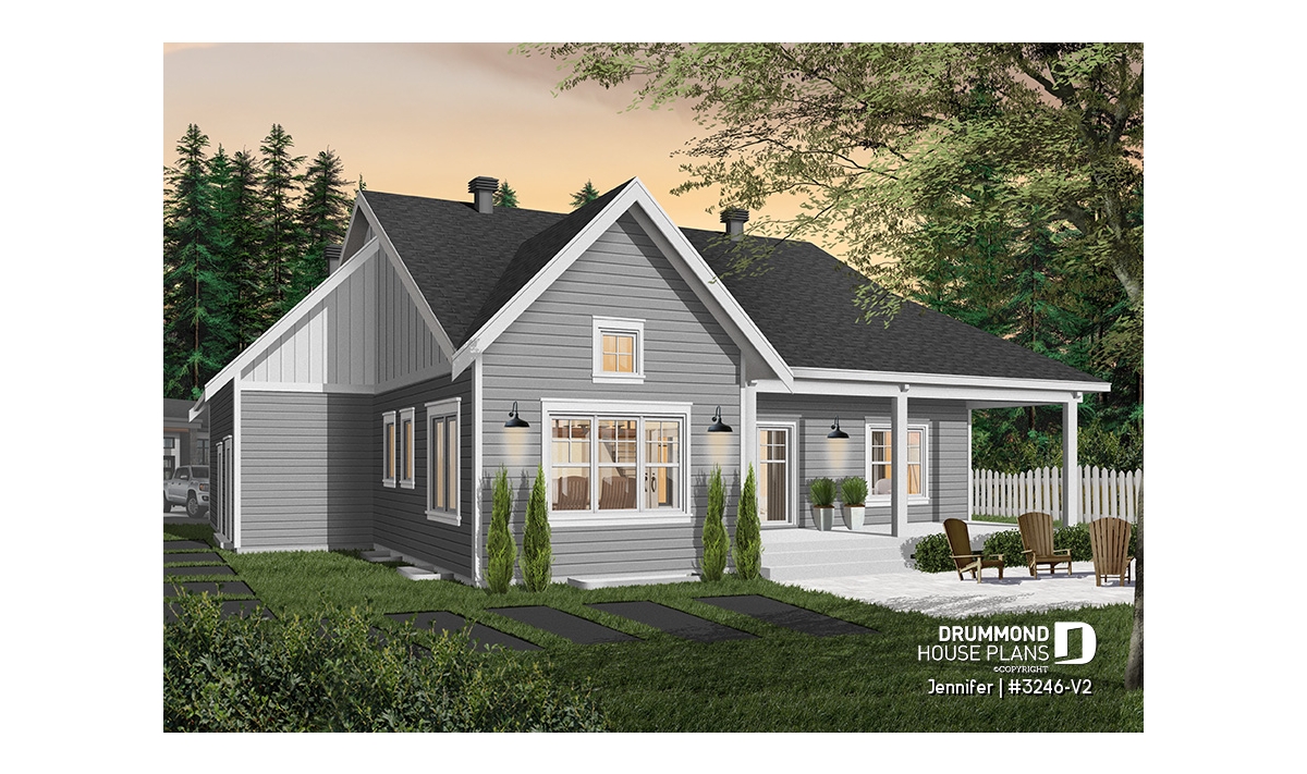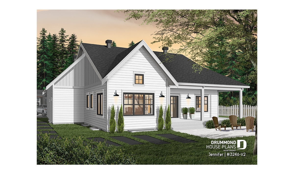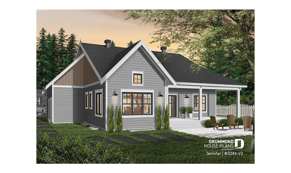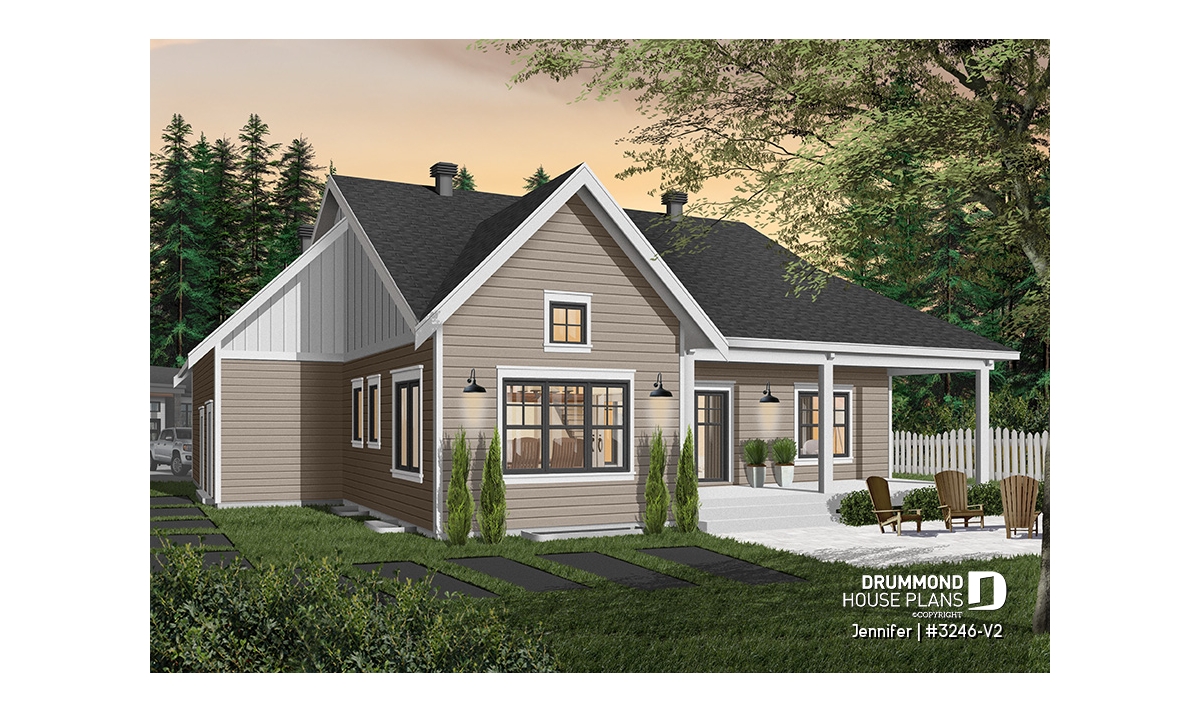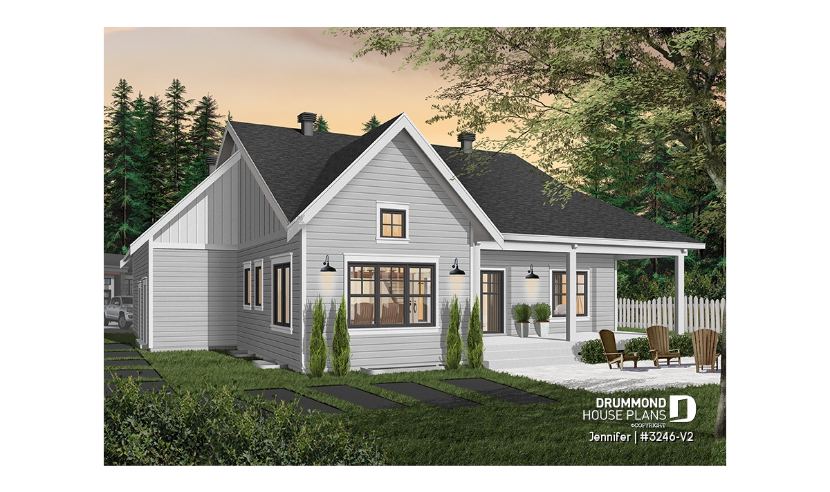 This country style house of one-story with double garage (plan 3246-V2, also named "Jennifer") suggests several most distinctive and interesting elements. The different options of exterior materials and colors suggested for this new house plan are very trendy this year: a touch of stone in the lower part, a partial steel roof and the exterior siding that is suggested horizontally as well as vertically. It should be noted that this house offers much brightness and light due to its large number of fitted windows (see the floor plan for better visualization).