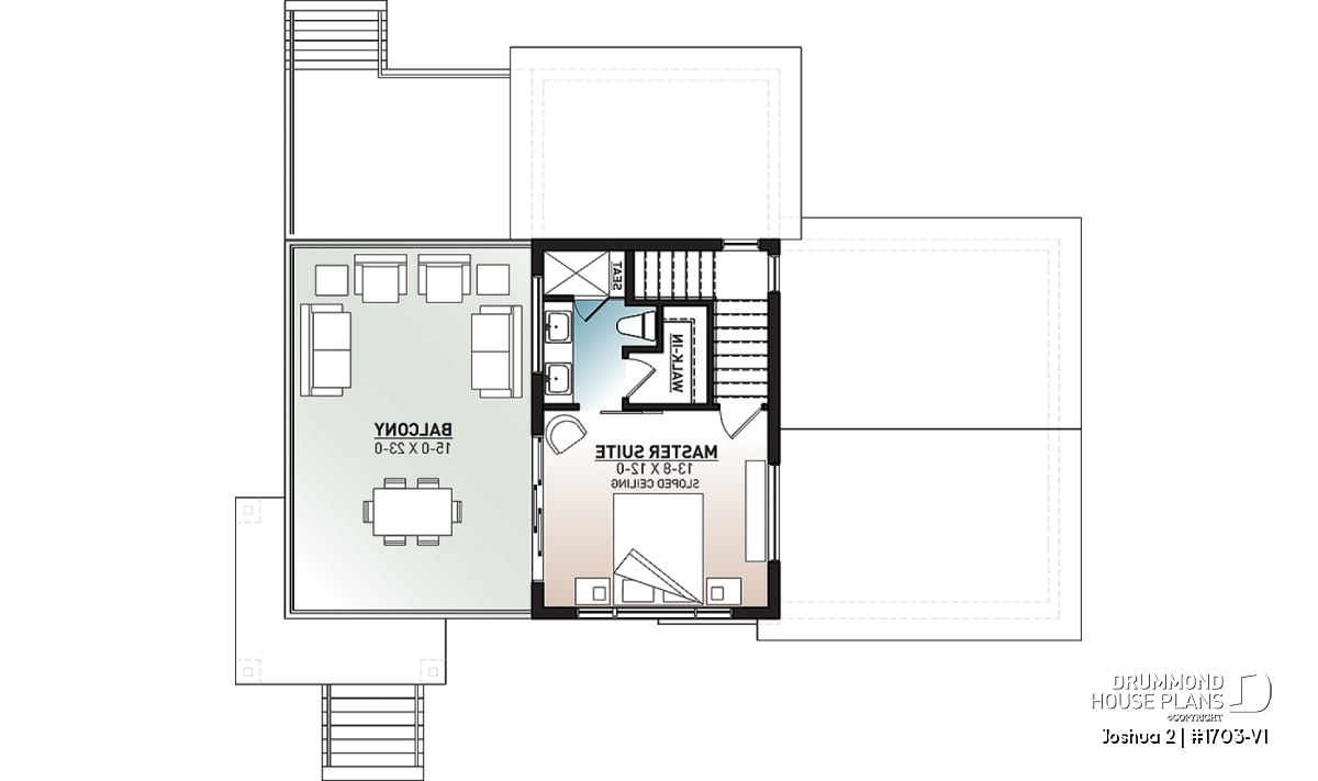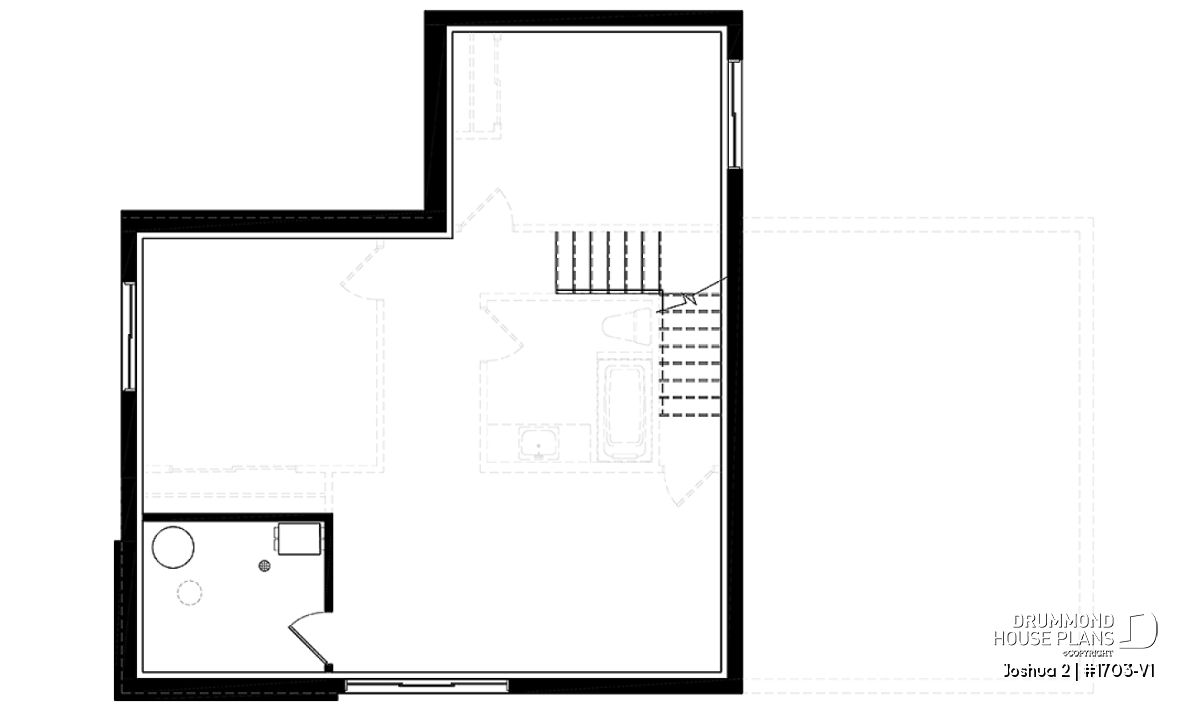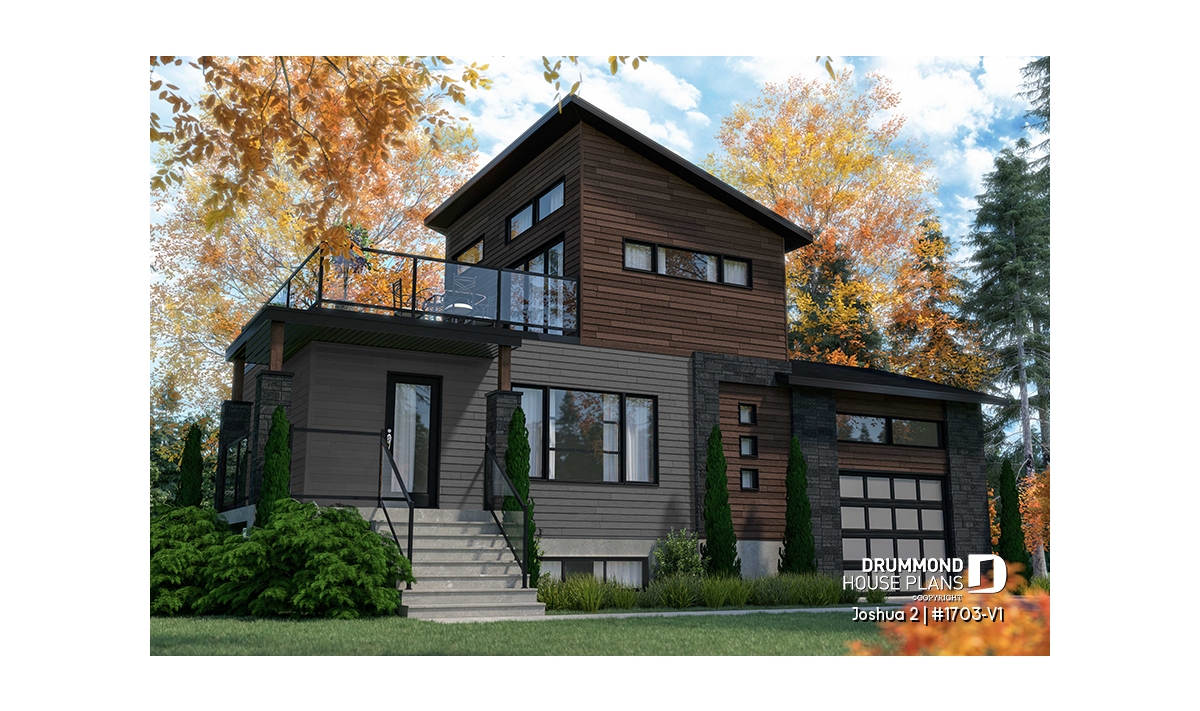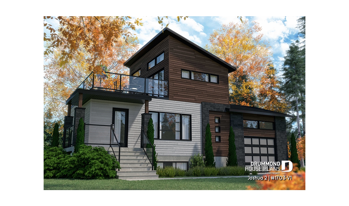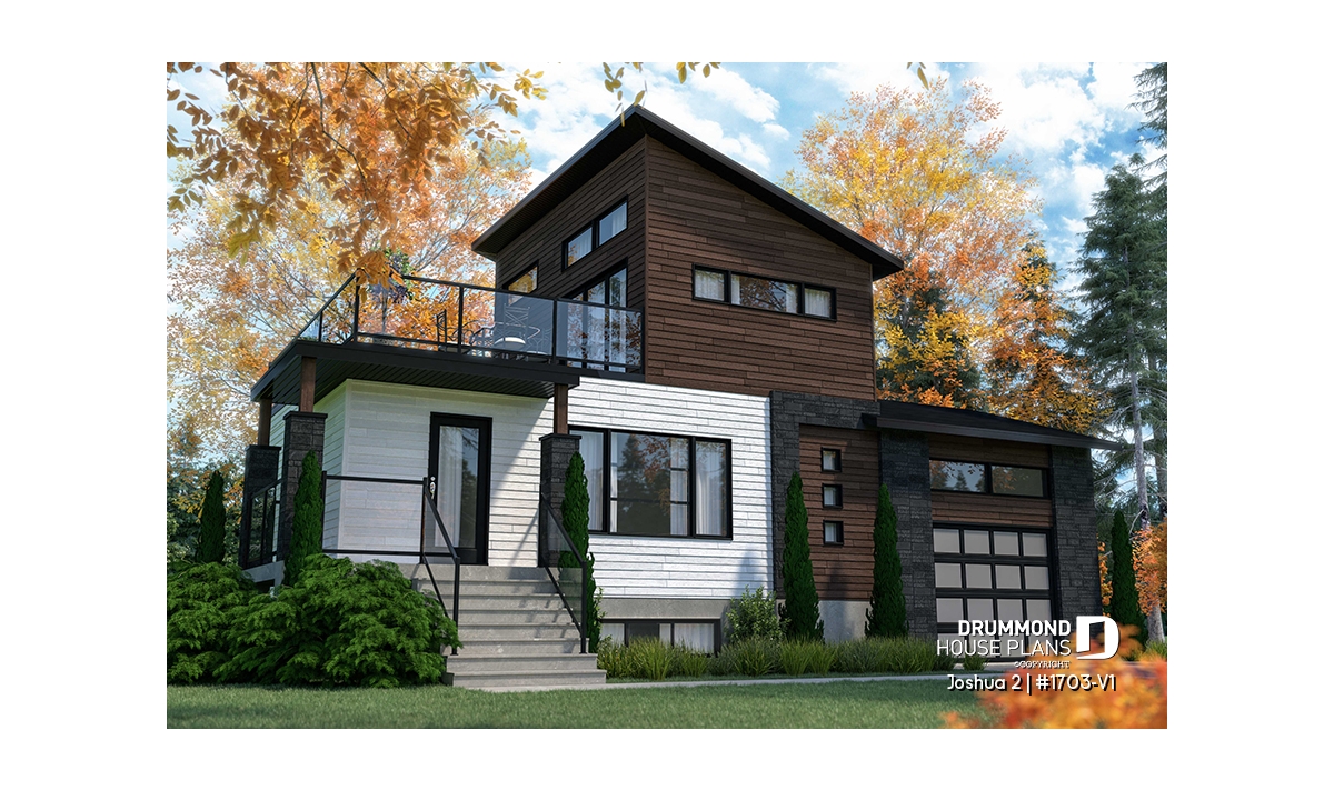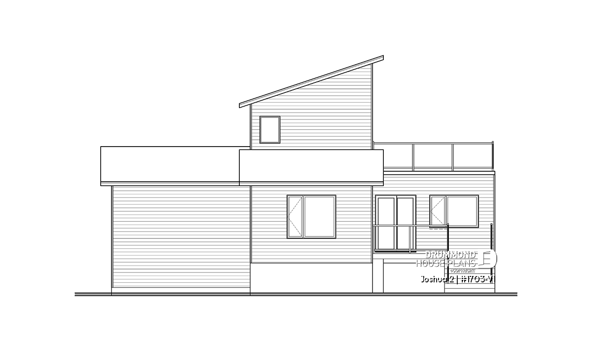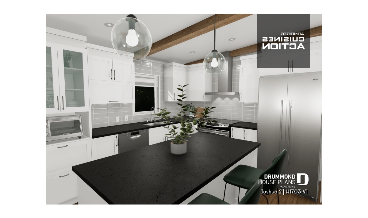 The Joshua 2 house plan (1703-V1) offers 1188sqft of living space. The height of the ground floor ceilings are a standard height of 8ft. Entering this modern house, a vestibule separates us from the living room, kitchen and dining room which are open plan.