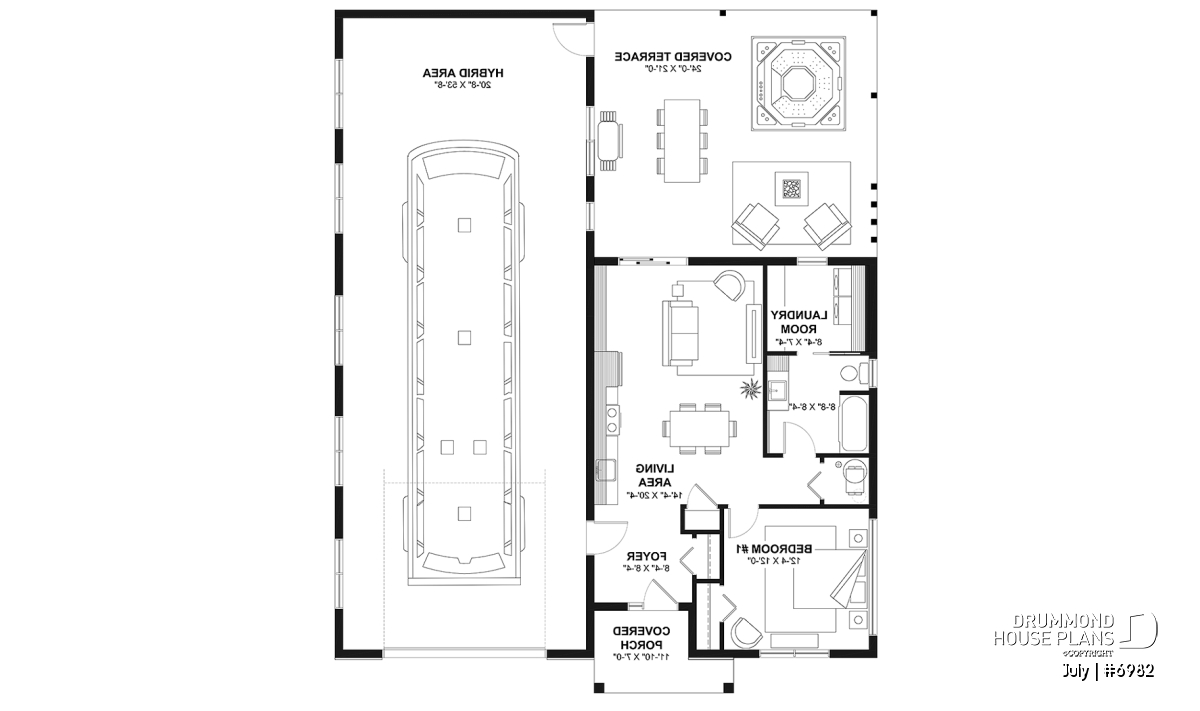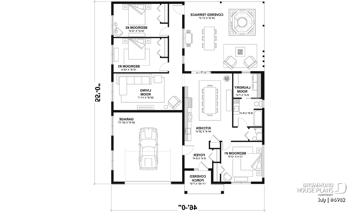 An alternate layout option illustrates a different vision for the JULY (#6982). In this version, the original dining nook and small living area are reconfigured into a larger dining space designed to comfortably seat up to eight people. The RV garage is converted into a single front-facing garage, while the rear portion is transformed into two bedrooms and a secondary living room. These newly created spaces feature dramatic 16-foot 6-inch ceilings, while the remainder of the home maintains its 10-foot ceiling height. The large covered rear terrace remains unchanged.