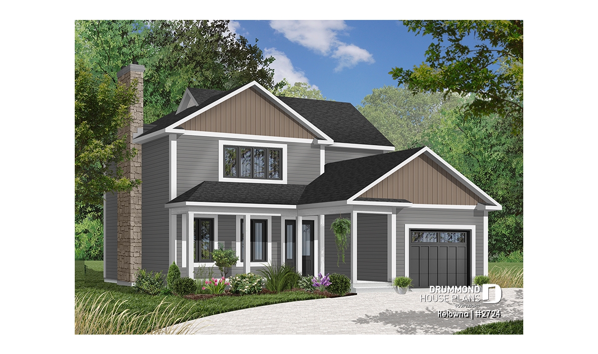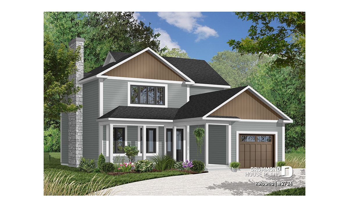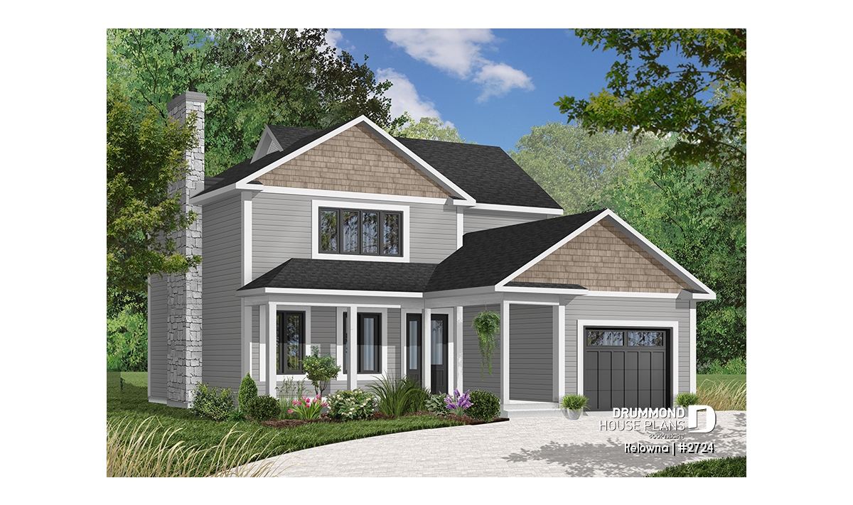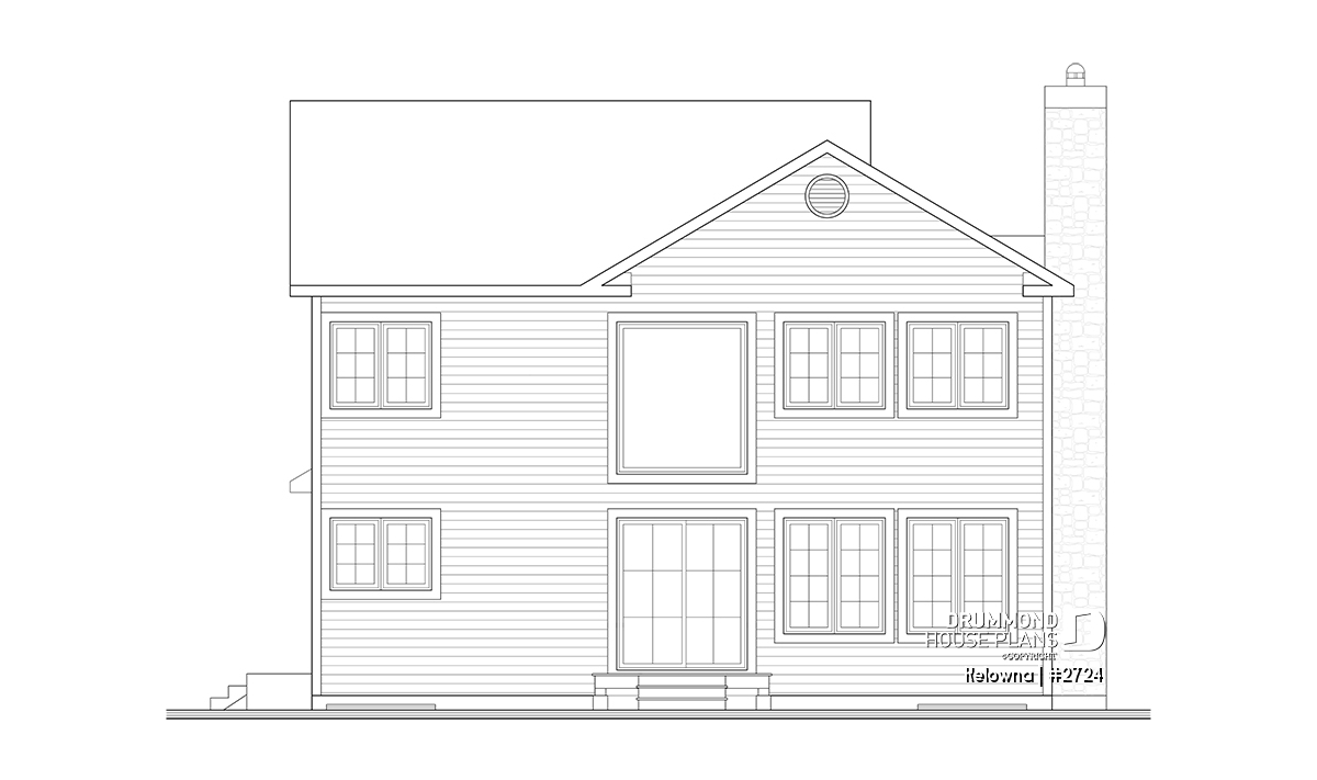Fireplace with possible exit in basement, sloped ceiling in master bedroom, covered front balcony, service doors on side of garage and access to home, generous fenestration illuminates stairwell, laundry facilities near kitchen, service door and patio door near kitchen.