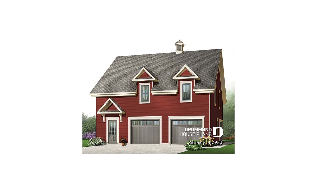 The Kilkenny (#3983) garage plan offers a triple-car country-style design distinguished by its generous layout and exceptional flexibility. Enhanced by two attractive dormers, its architecture blends naturally with a wide range of residential styles, including traditional, contemporary and rural-inspired homes.