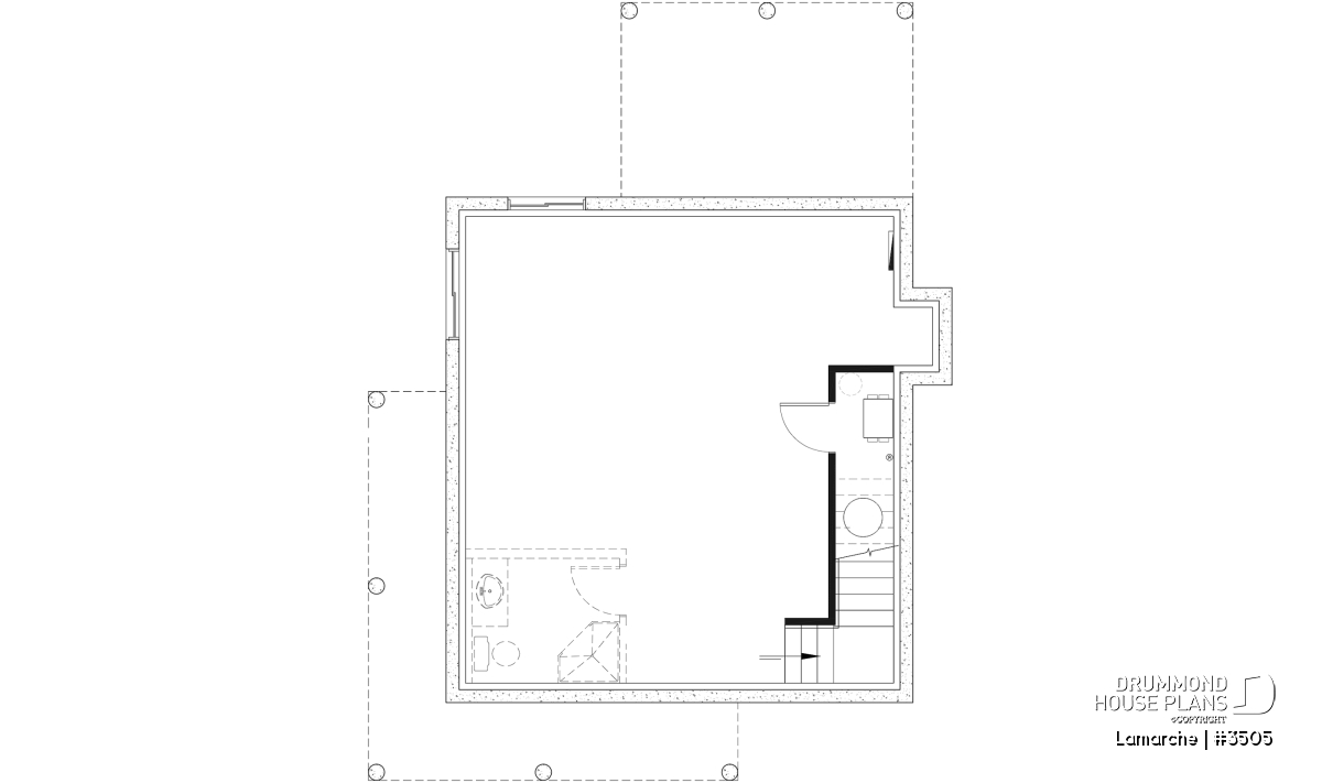 The LAMARCHE house plan (#3505) features a charming two-story country-style design with warm rustic character, perfect for families or couples looking for a welcoming, bright, and thoughtfully designed home. With a total of 1,200 square feet of living space distributed between the main floor and the upper level, this compact model offers an efficient and comfortable interior layout. In addition, the 624-square-foot unfinished basement provides the opportunity to add extra living space according to current or future needs.