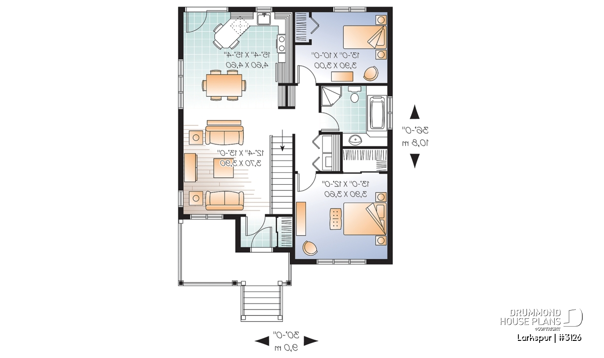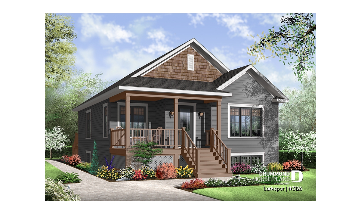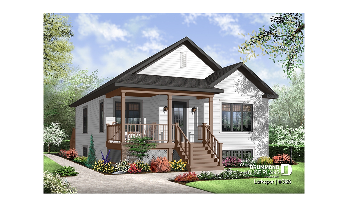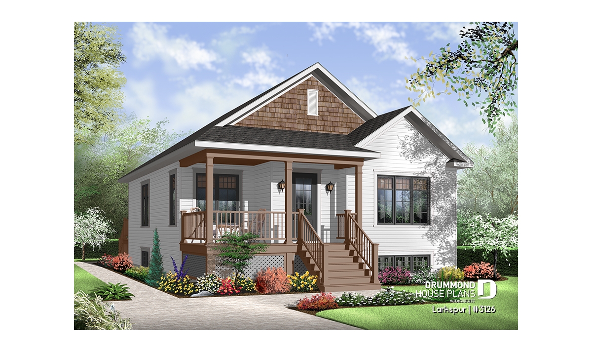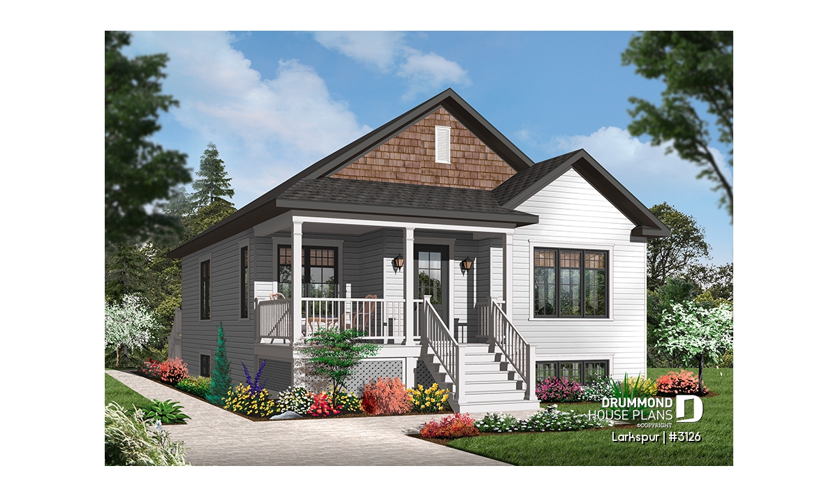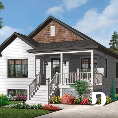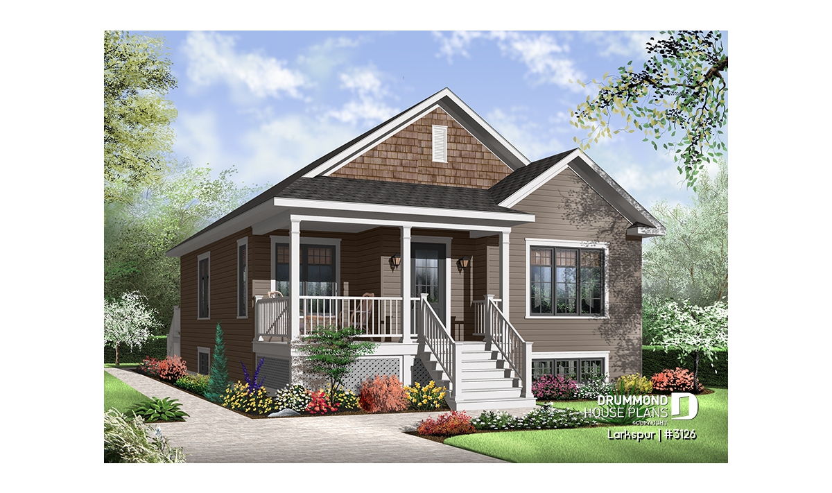 Economical and ecological - following the trend of efficient, affordable homes Drummond is pleased to offer this attractive model. A deep gable façade gives an undeniable visual impact. Read or visit on the charming L-shaped porch or merely enjoy the shelter from the elements as you enter with packages.