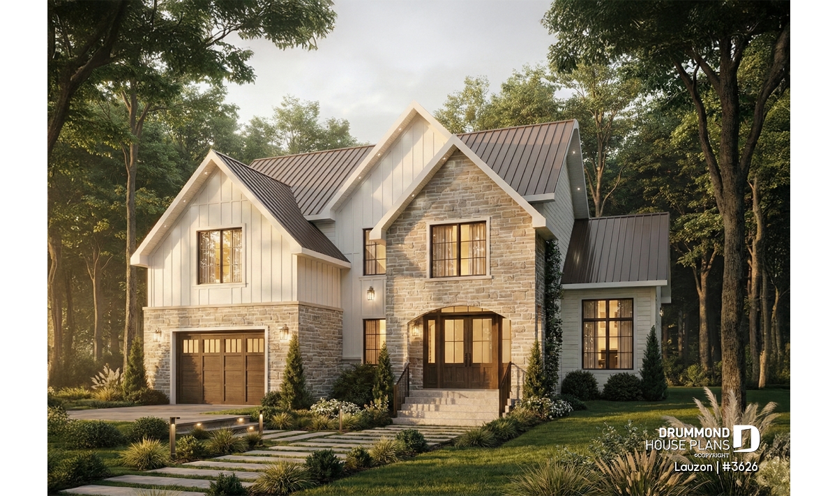 Designed for today’s families, the LAUZON (#3626) blends timeless country european charm with modern functionality and abundant natural light. Its warm exterior, enhanced with stone accents and Board & Batten siding, sets the tone right away: every detail has been thoughtfully considered.