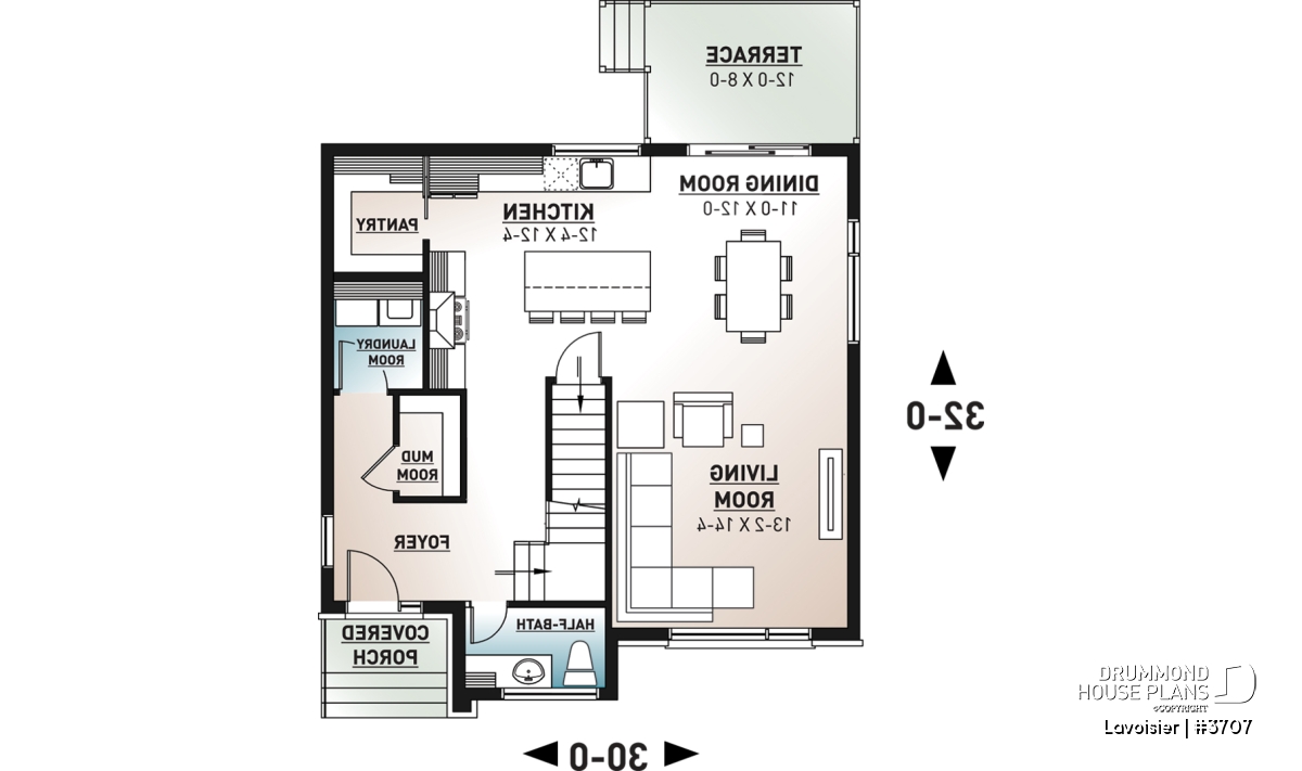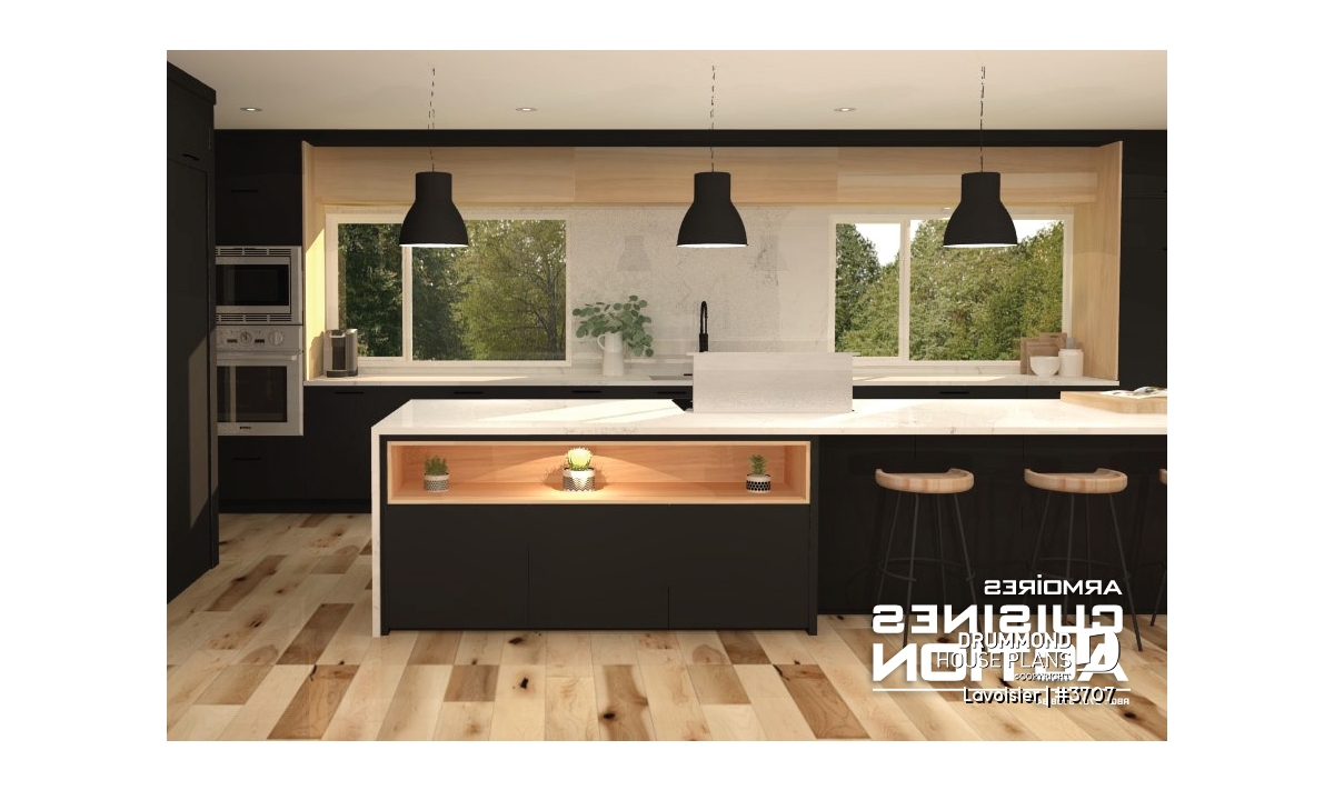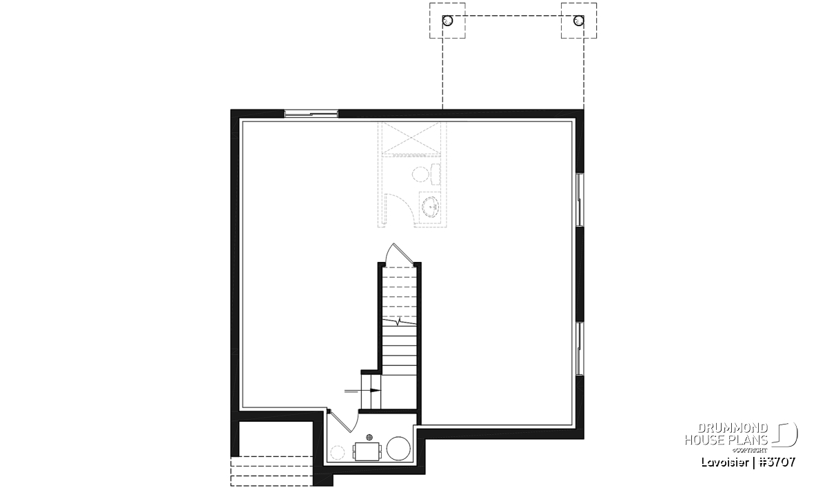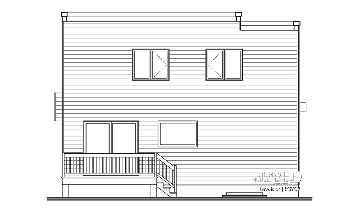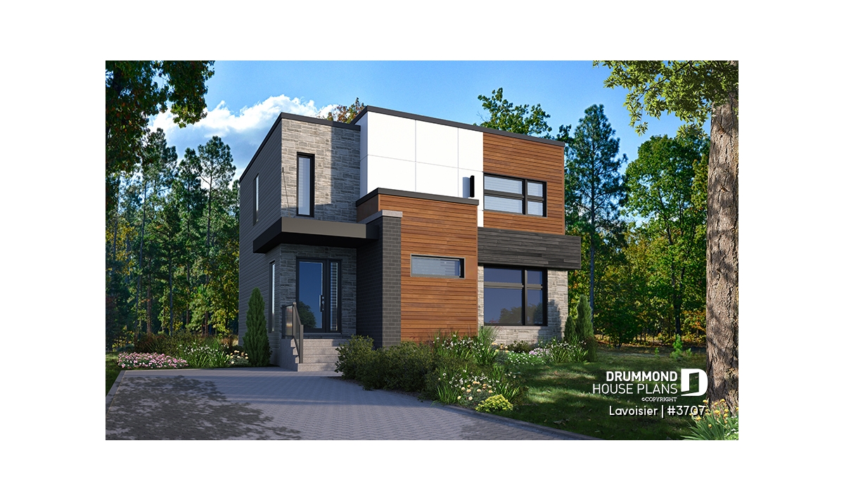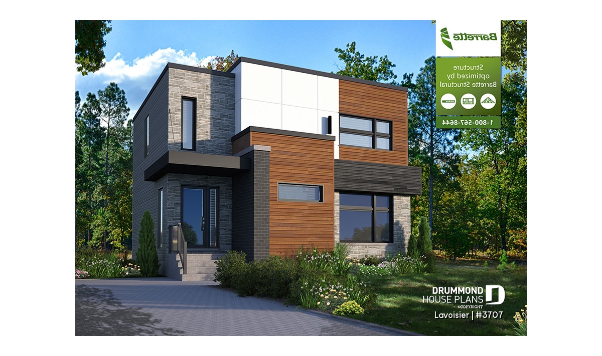 Drummond House Plans’ new cubic and modern style house plan #3707, that we also named “Lavoisier” has a unique and clean look, and is yet very affordable. This contemporary 2 story home plan has a total of 1680 square feet as well as an unfinished basement that can eventually be arranged to suit your future needs, also counts 3 bedrooms on the second level.