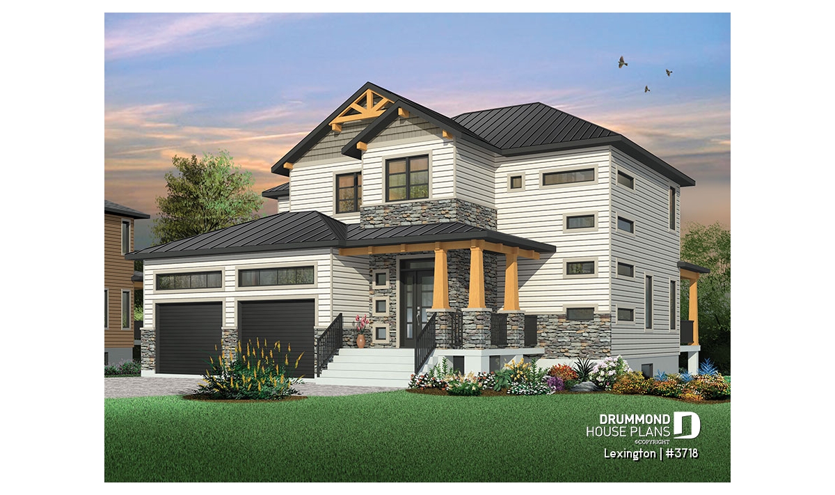 The stark modern design contrasts with wood pillars and accents, stone and a steel roof to give this model a uniquely modern/rustic feel.
