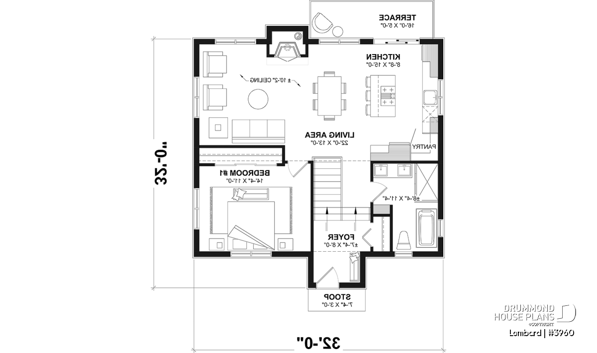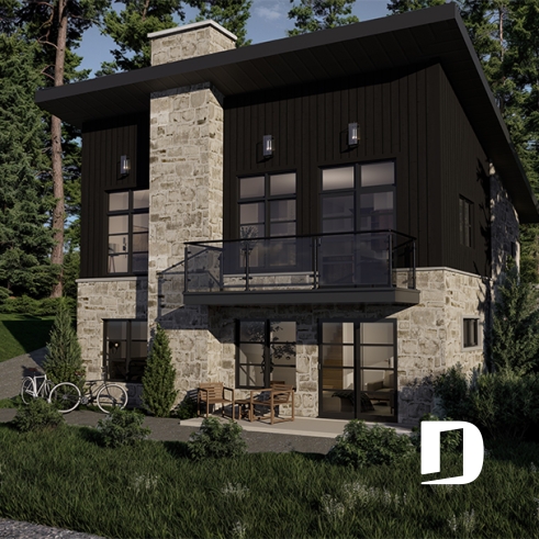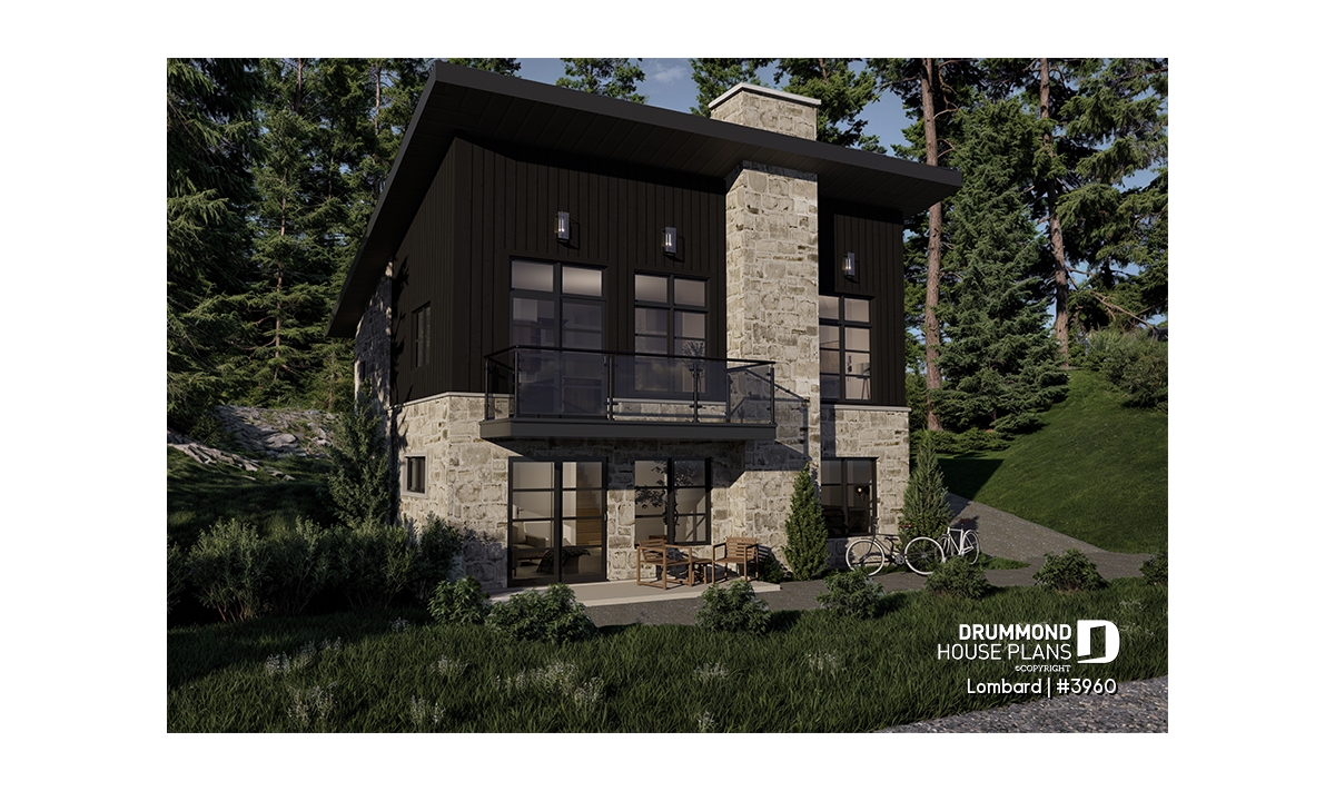 This modern rustic cabin plan combines authentic charm with contemporary living. Dark materials and stone give the exterior a warm, distinctive look, while expansive windows frame panoramic rear views and flood the interior with natural light. A 10-foot ceiling in the main activity area creates a sense of openness, making this design perfect for family gatherings or quiet retreats.