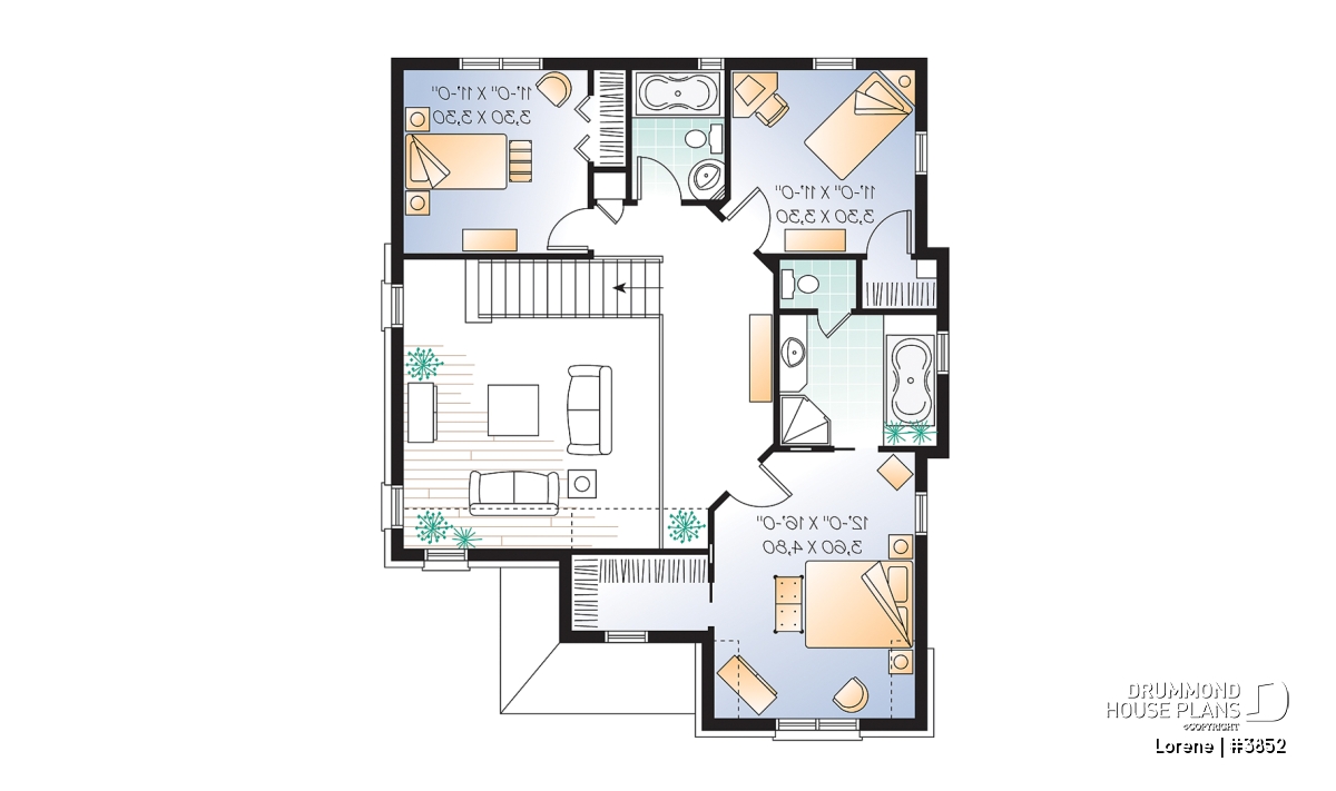 Family room with ceiling at nearly 15 feet opening up on mezzanine at second level. Nicely organized second level with master bedroom suite and a second bathroom shared by secondary bedrooms.