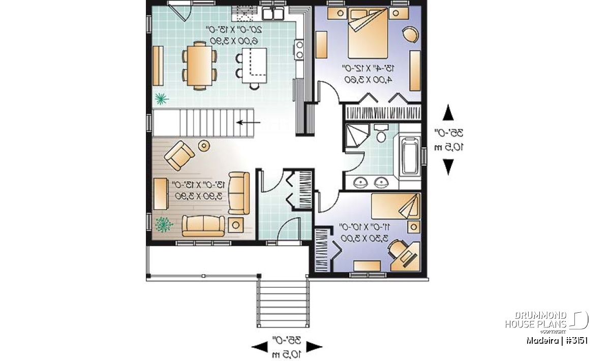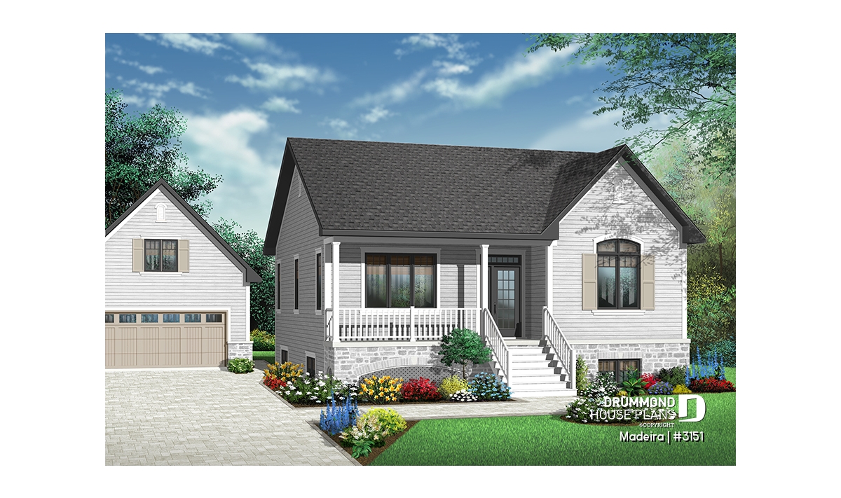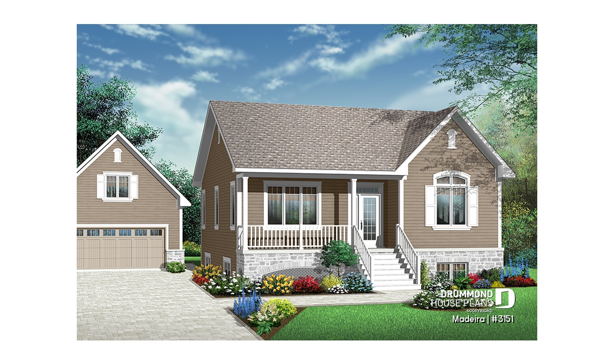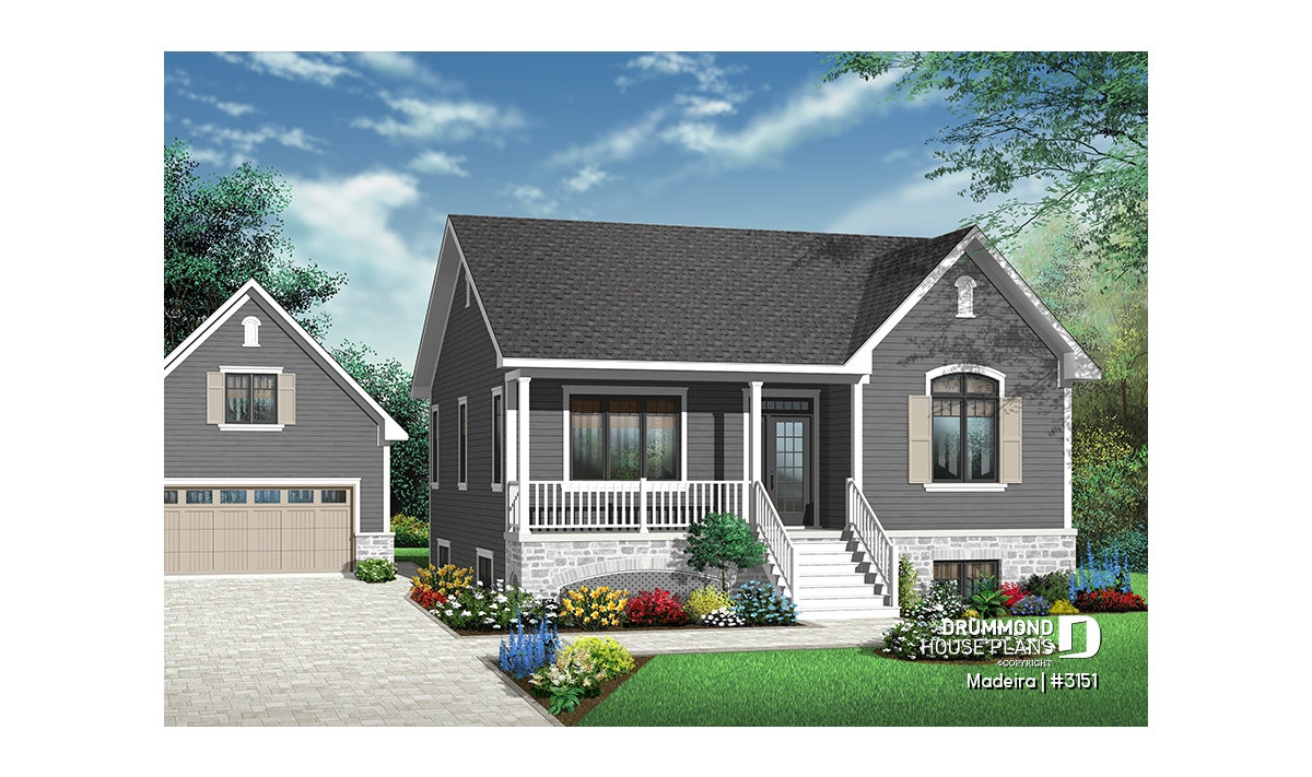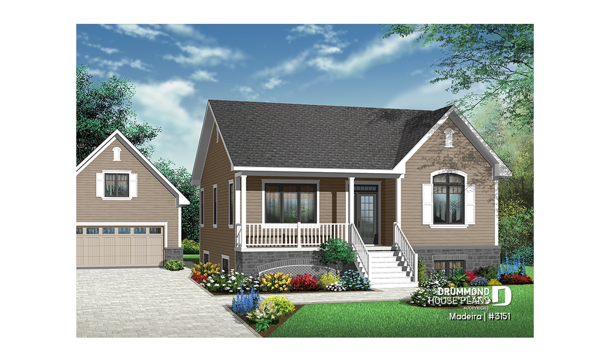 The ever-changing needs of our society have greatly influenced us at Drummond Designs and have incited us to propose plans which are even more adapted to today’s reality. In order to meet with the expectations of larger and/or reconstructed families, here is a bungalow that is completely equipped on both floors to meet with the needs and expectations of these families. For these reasons, this model of bungalow is first and above all a 5 bedroom home of which 3 are in a semi-basement with fenestration in accordance with established norms as to evacuation in case of a fire; incontrovertible norms that are unfortunately, not often taken into account when planning rooms in the basement. This model also proposes an completely open activity centre on the ground floor, a kitchen with a lunch counter, well distributed fenestration offering sufficient natural lighting and in the basement, a family room, a laundry room, storing space, a very functional shower and closed-in toilet as well as an impressive cold storage room under the front veranda, as is needed for such families.