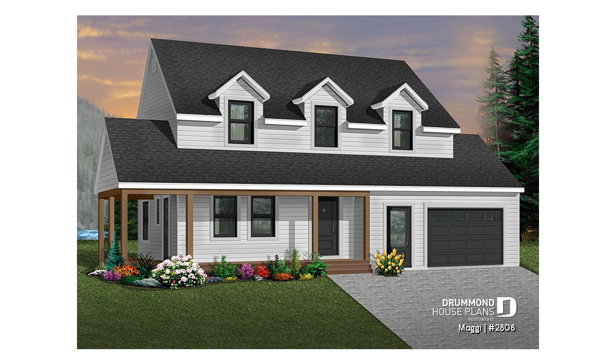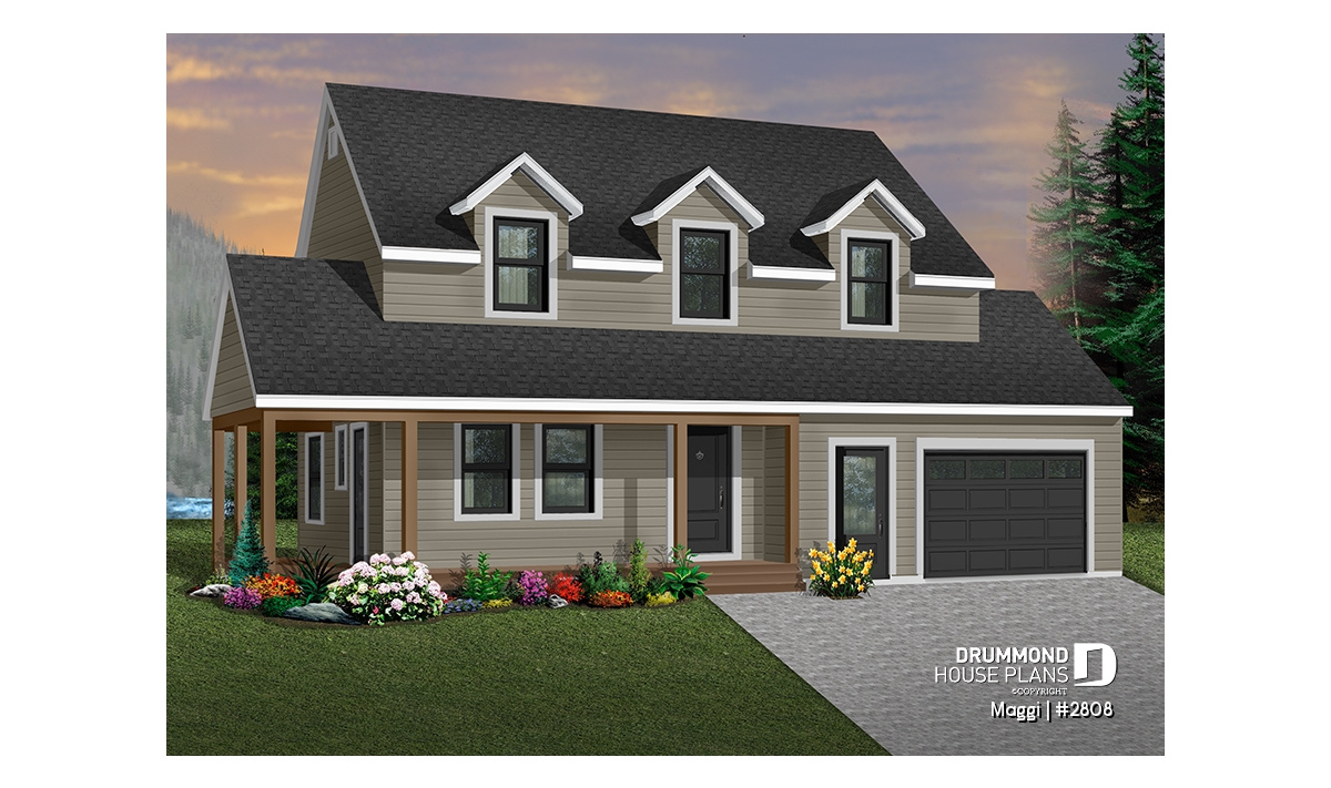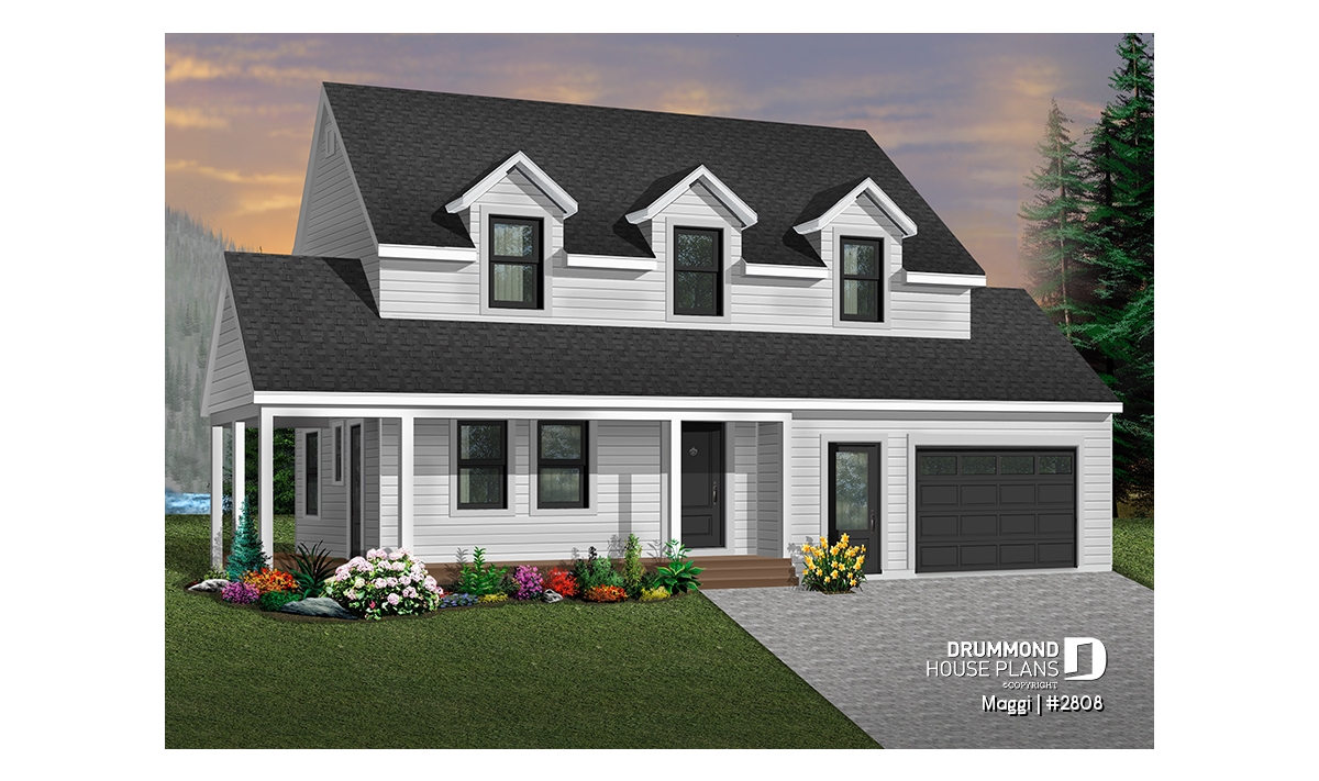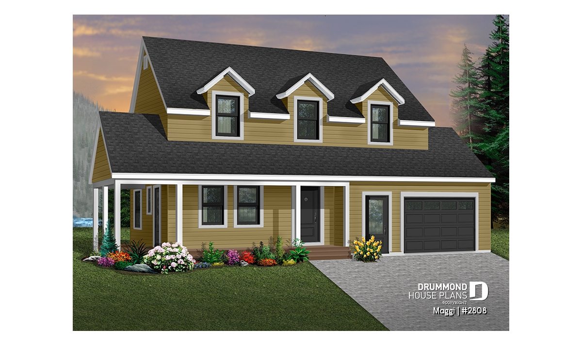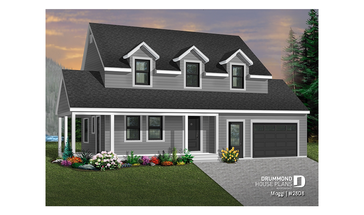 Country style 3 bedroom house plan with large one-car garage. On the main floor there is a laundry room with an half bath and an open kitchen, dining and living room floor plan concept. The second floor offers a master bedroom with large walk-in closet and access to full family bathroom, and 2 secondary good size bedrooms. Unfinished daylight basement. Other foundation options are available.