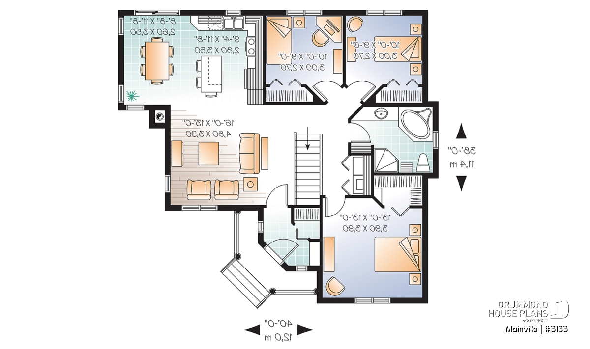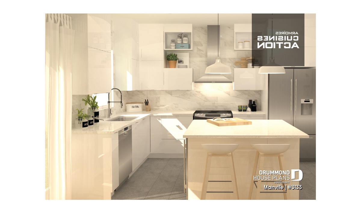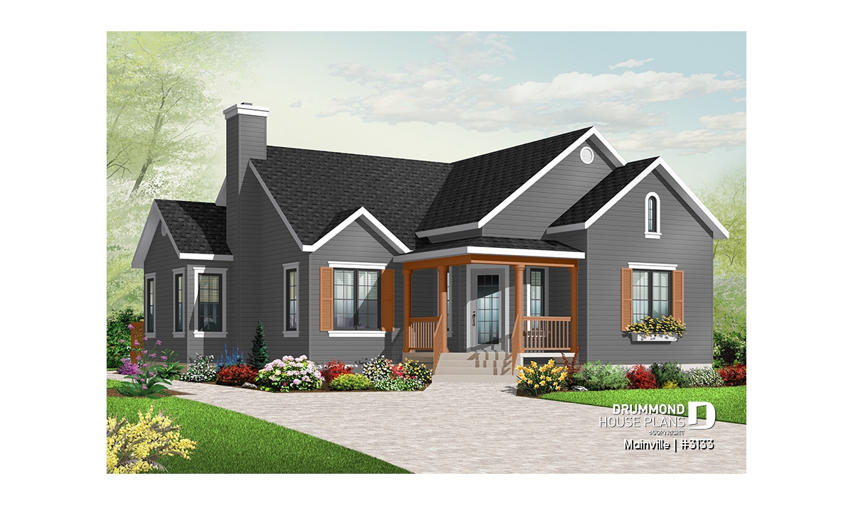 Inspired by the Traditional home style, this beautiful home has retained the curb appeal, the inviting porch and the symmetrical gable design of the original but the added projection to the right side not only enhances the dining area with well fenestrated square footage it also adds enough space to accommodate three bedrooms on the main floor.