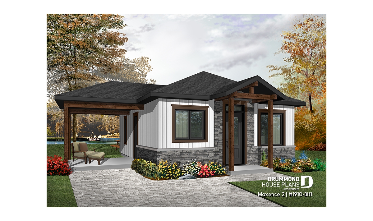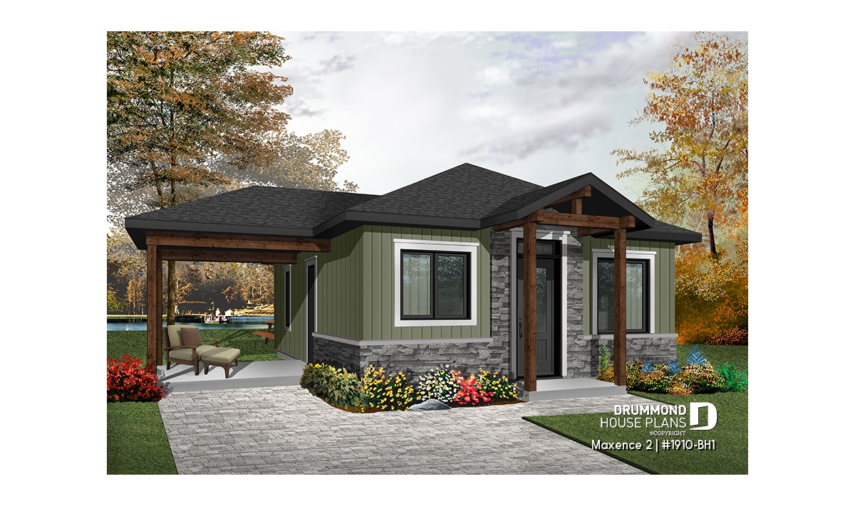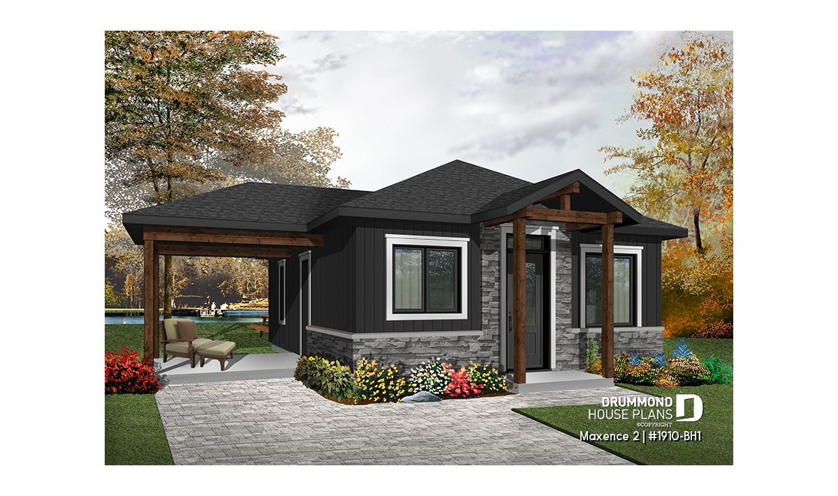 Small modern rustic 2 bedroom home plans, open kitchen and family room, large side covered deck