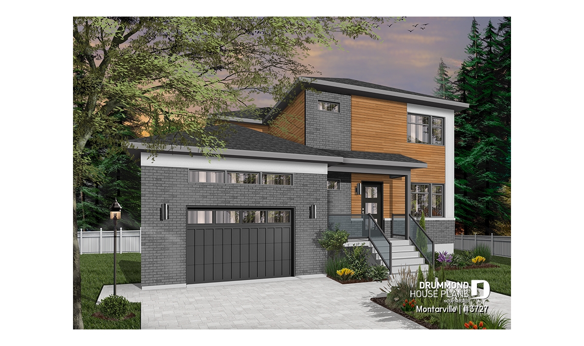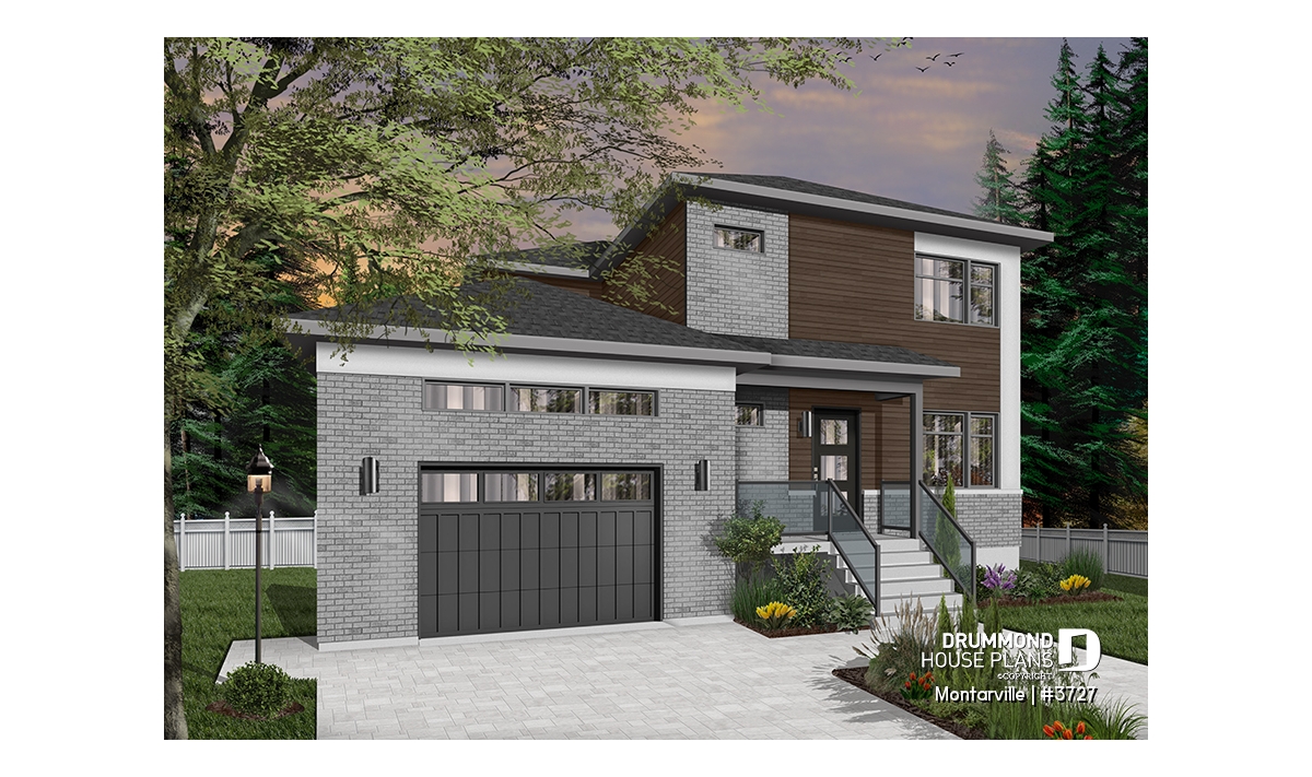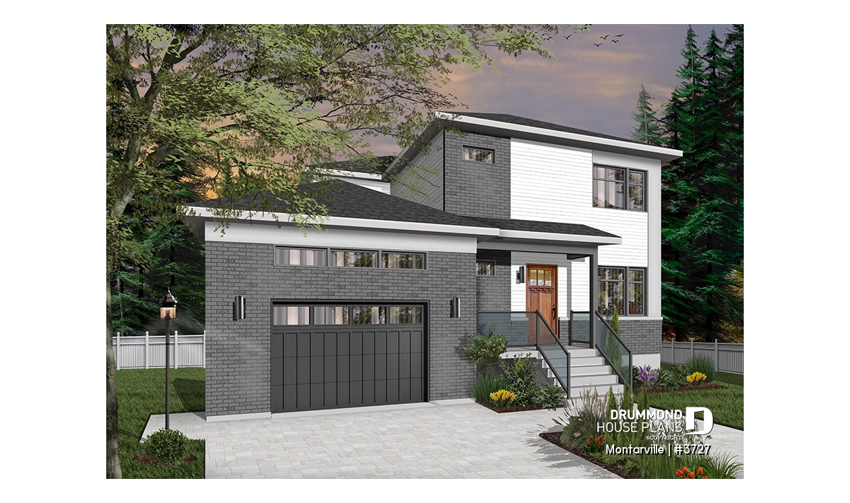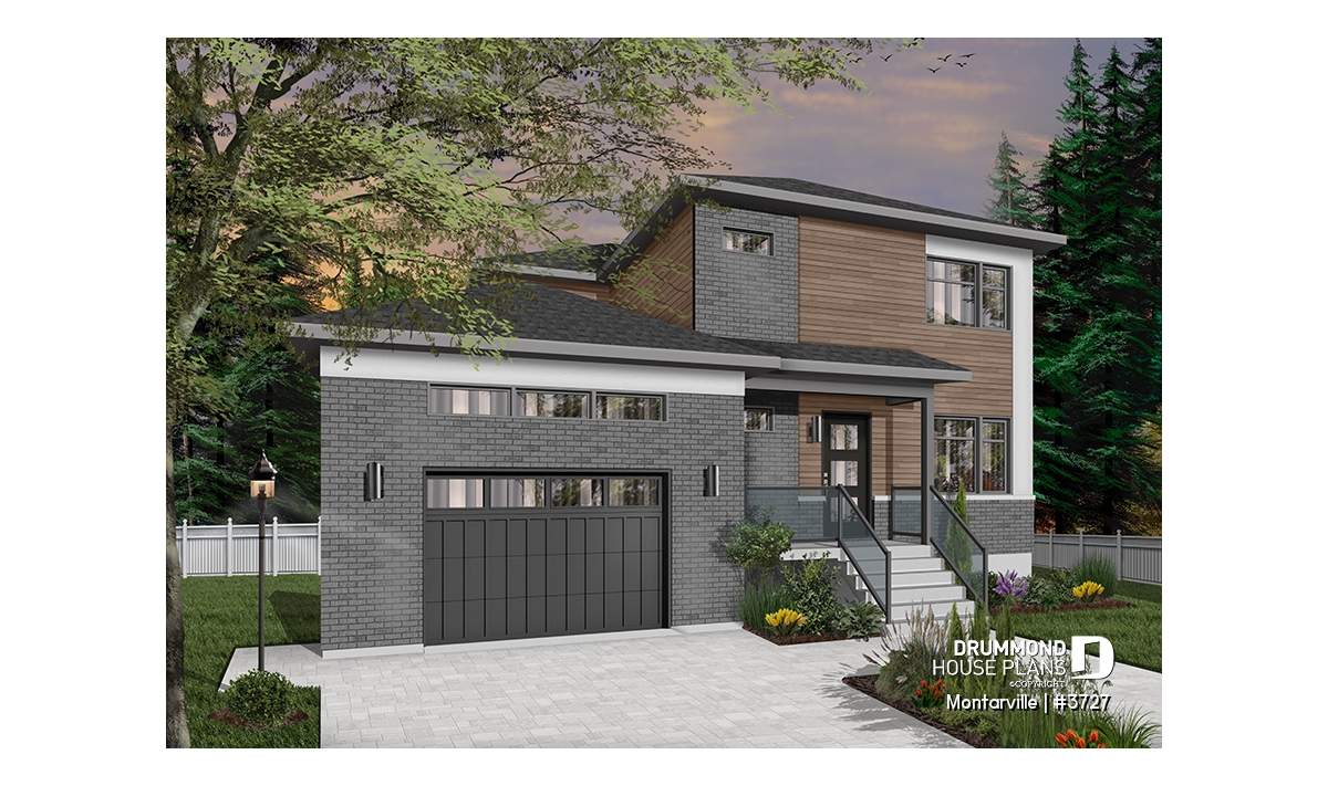 We invite you to discover this new modern style home plan with garage, our plan number #3727 also named MONTARVILLE. We truly believe you will appreciate the big open space and the many amenities that offers this 2110 square feet house plan. With its contemporary style, this home offers 3 to 4 bedrooms on the second level in addition to an open space concept in the common areas on the main level.