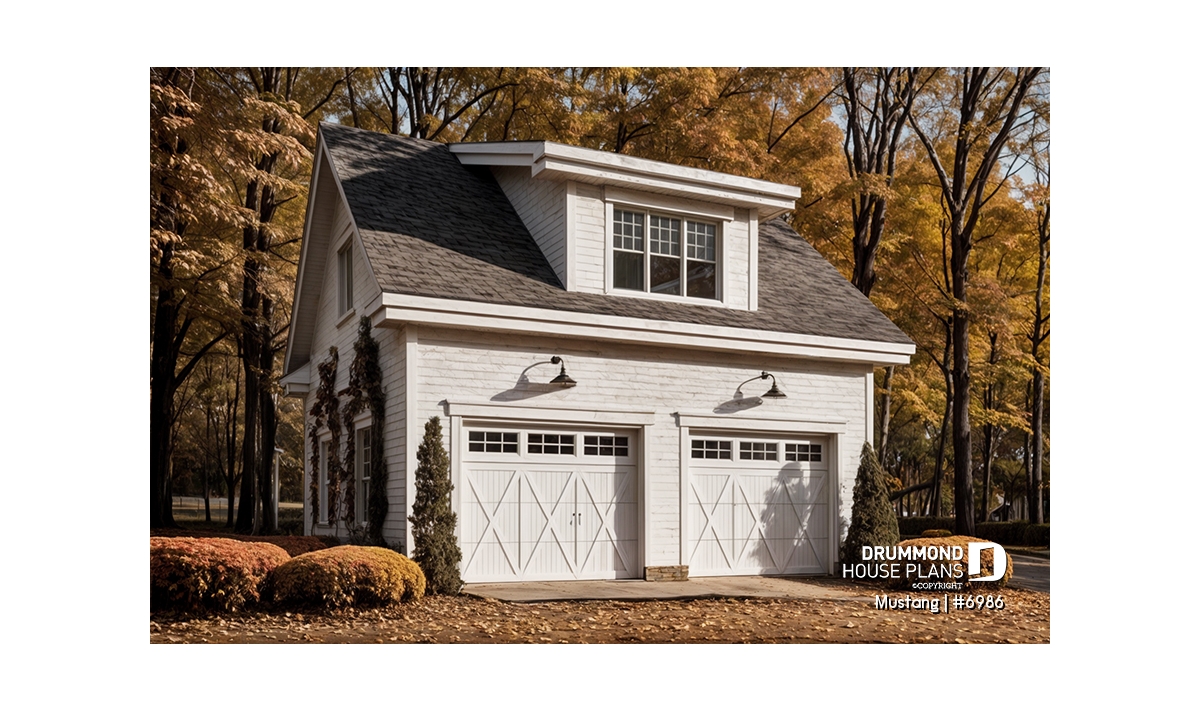 Two-car garage plan, country style, storage area on second floor