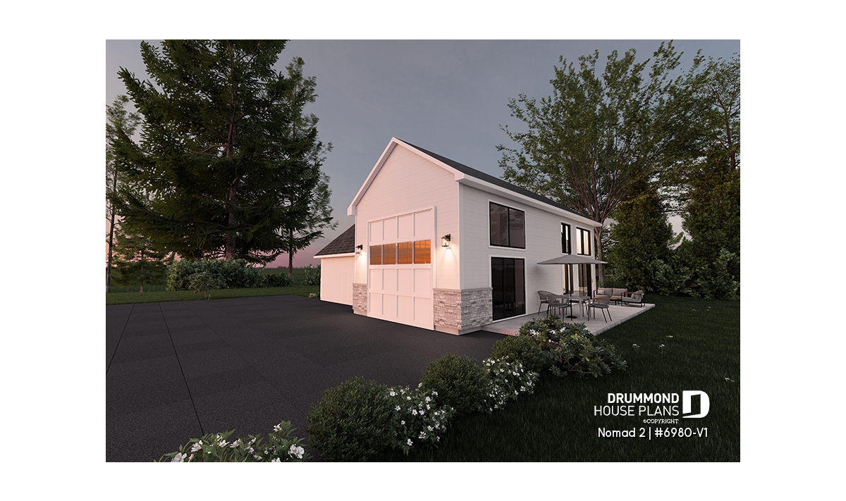 "Nomad 2" house plan (# 6980-V1) is the second in the series of 6 models from the HYBRID collection. This project was developed for a home builder wishing to offer a scalable home concept to a groupe of customers who own a recreational vehicle (RV), such as a motorhome, a fifth wheel or a trailer home. This collection offers an alternative accommodation for travelers, retirees and/or adventurers, wishing to have a "home away from home" with family and friends as well as a garage space allowing storage and access to their RV directly from their home.