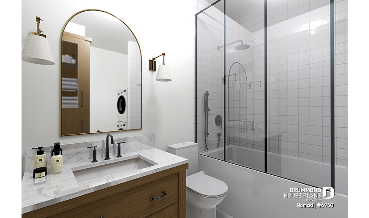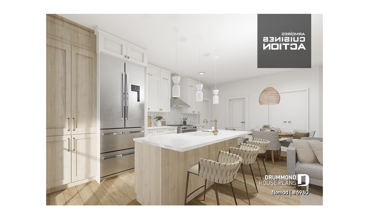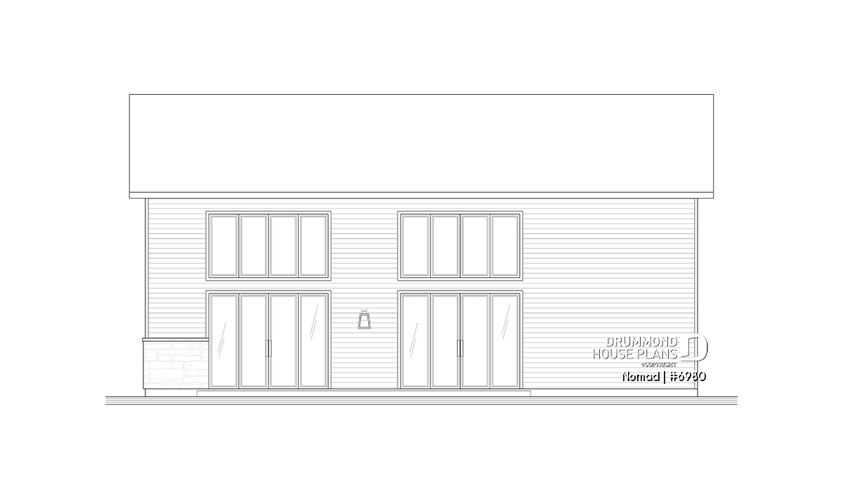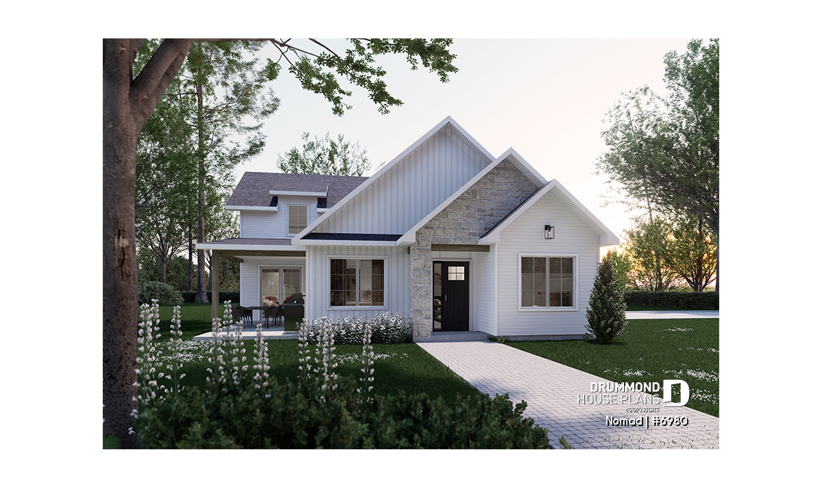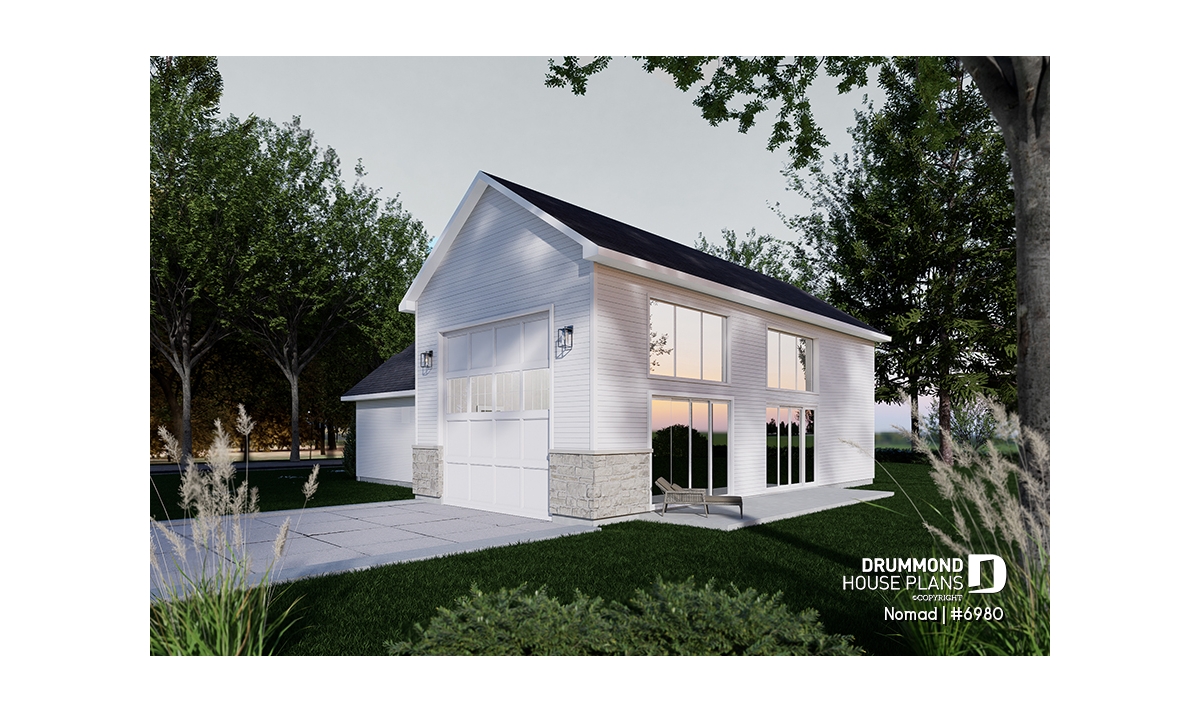 Nomad house plan (#6980) is the first in a series of 6 models from the HYBRID collection. This project was developed for a home builder wishing to offer a scalable home concept to a group of customers who own a recreational vehicle (RV), such as a motorhome, a fifth wheel or a trailer home. This collection offers alternative accommodations for travelers, retirees and/or adventurers, wishing to have a "home away from home" with family and friends as well as a garage space allowing storage and access to their RV directly from their home.