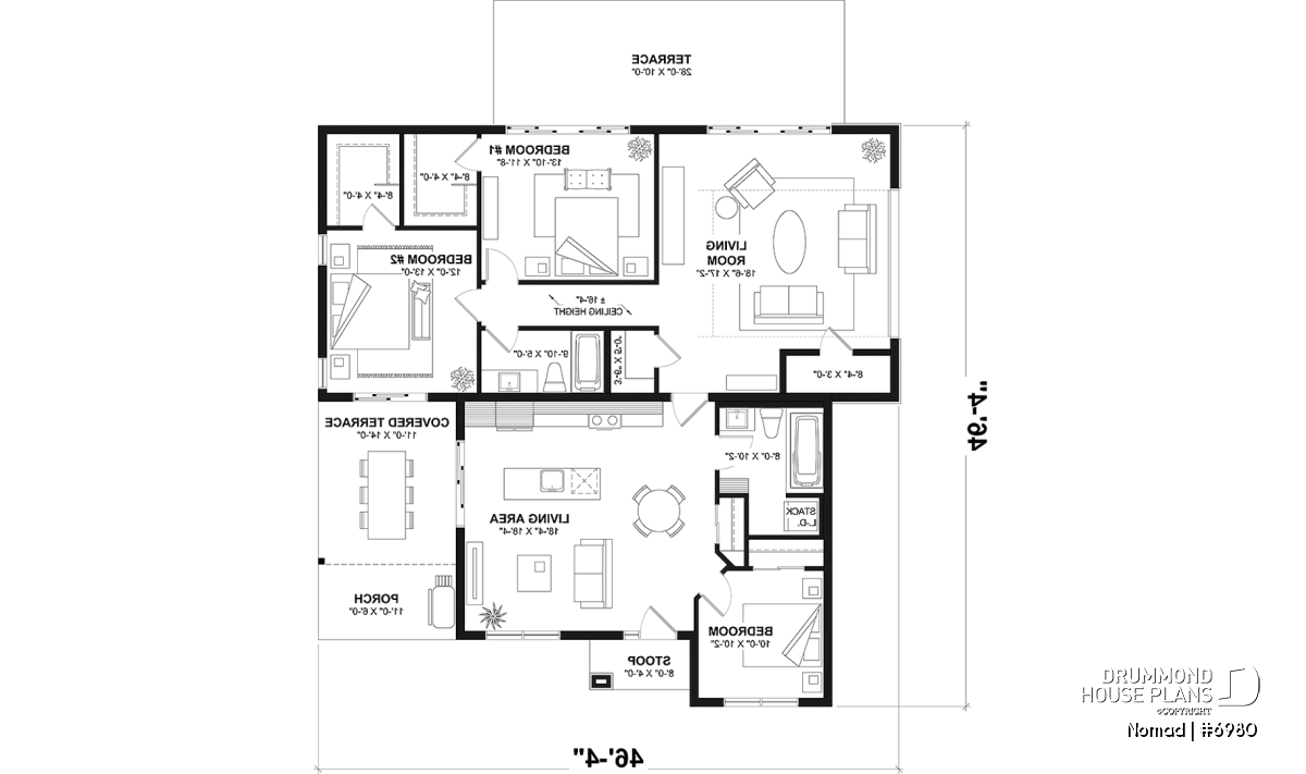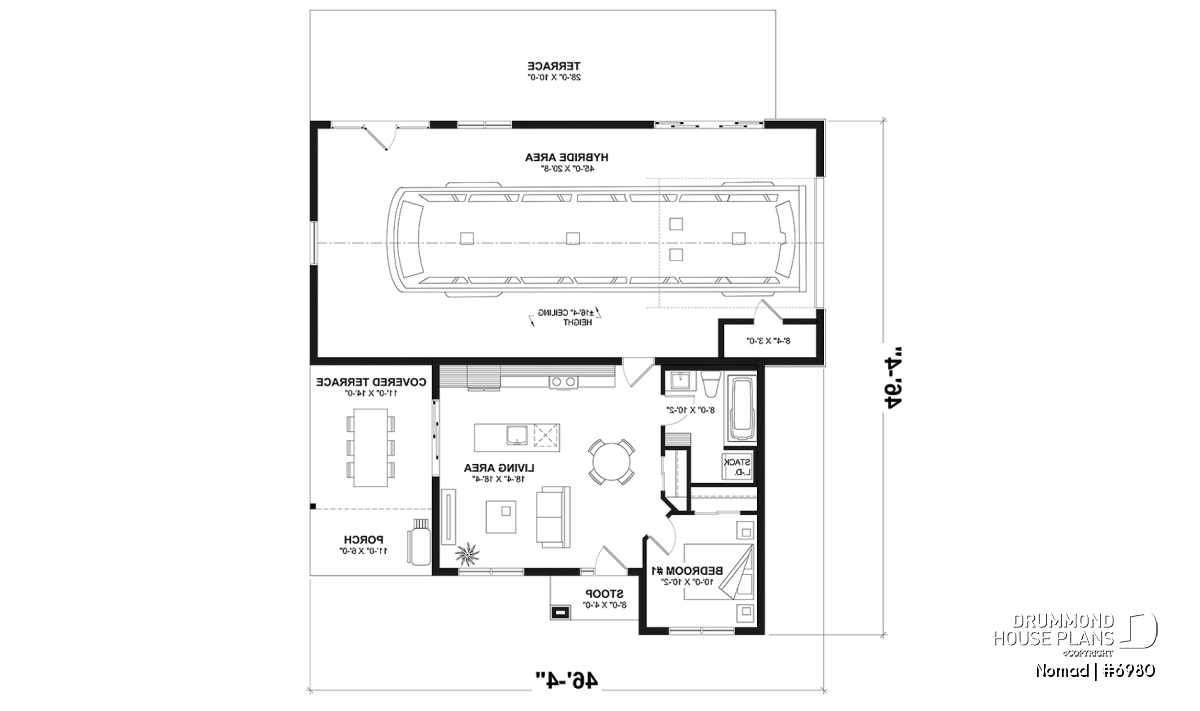 The basic plan of the NOMAD house (plan #6980) offers a floor space of 650 sq.ft. concentrated on one level. The attached RV garage is 45' x 20'-8'', or 1119 sq.ft., and two double patio doors are fitted there allowing the possible addition of a terrace or patio towards the backyard. Also the RV garage has a 16' x 4'' ceiling height. A magnificent and large sheltered side terrace is accessible from both the kitchen and the garage. The foundation of this house is on a floating slab, but it should be noted that other foundation options are available on our website, or via our plan modification service; contact us for details.